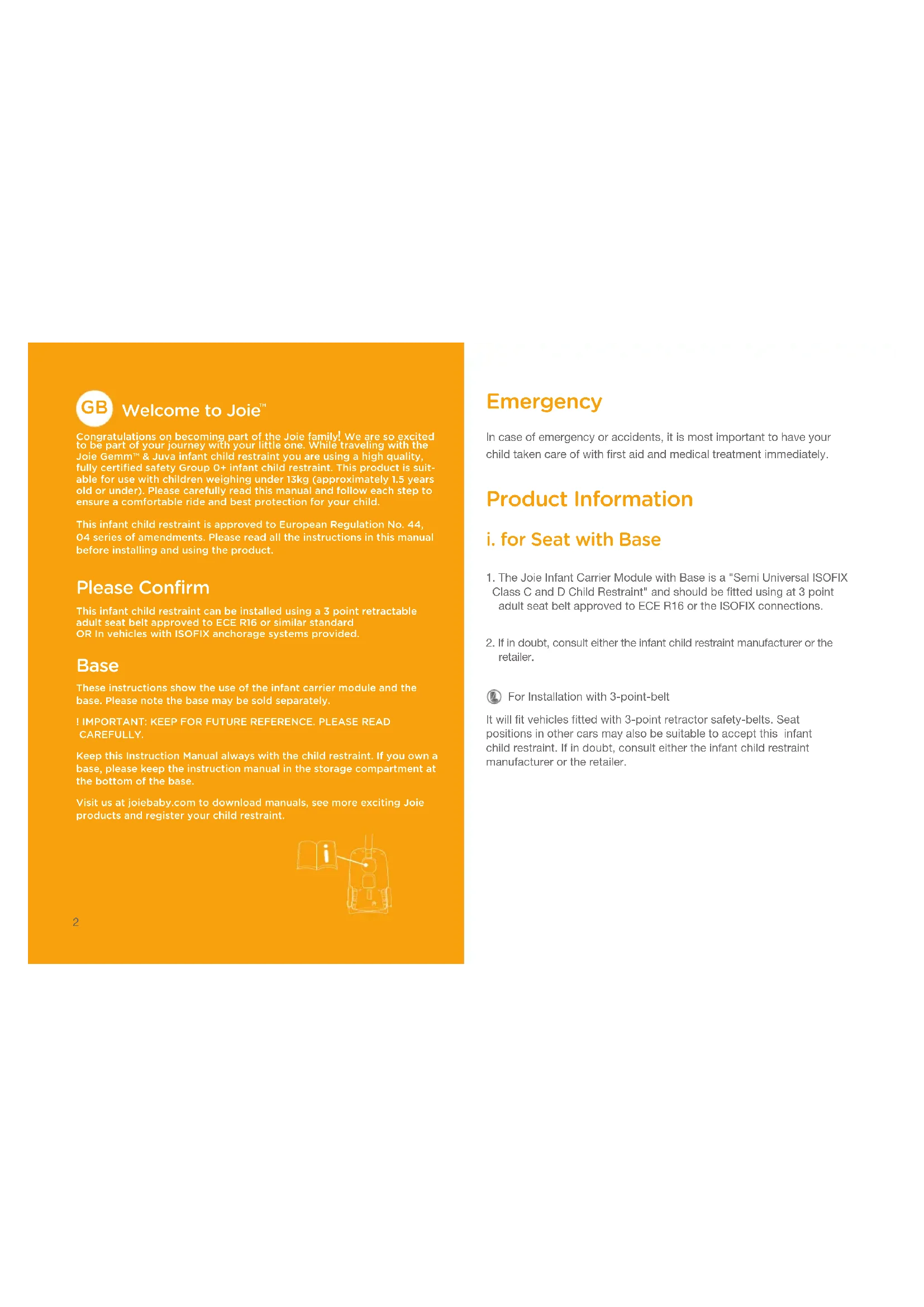 Congratulations on becoming part of the Joie family We are so excited to be part of your journey with your little one. While traveling with the Joie Gemm™ & Juva infant child restraint you are using a high quality, fully certified safety Group 0+ infant child restraint. This product is suit-able for use with children weighing under 13kg (approximately 1.5 years old or under). Please carefully read this manual and follow each step to ensure a comfortable ride and best protection for your child.This infant child restraint is approved to European Regulation No. 44, 04 series of amendments. Please read all the instructions in this manual before installing and using the product. Please Confirm This infant child restraint can be installed using a 3 point retractable adult seat belt approved to ECE R16 or similar standardOR In vehicles with ISOFIX anchorage systems provided. Base These instructions show the use of the infant carrier module and the base. Please note the base may be sold separately.! IMPORTANT: KEEP FOR FUTURE REFERENCE. PLEASE READ CAREFULLY.Keep this Instruction Manual always with the child restraint. If you own a base, please keep the instruction manual in the storage compartment at the bottom of the base.Visit us at joiebaby.com to download manuals, see more exciting Joie products and register your child restraint. Emergency In case of emergency or accidents, it is most important to have your child taken care of with first aid and medical treatment immediately. Product Information