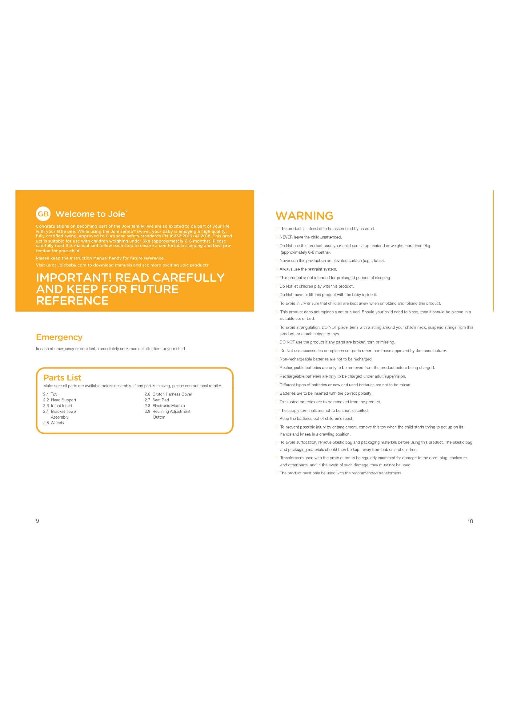 REFERENCE Emergency In case of emergency or accident, immediately seek medical attention for your child. WARNING ! The product is intended to be assembled by an adult.! NEVER leave the child unattended.! Do Not use this product once your child can sit up unaided or weighs more than 9kg (approximately 0-6 months).! Never use this product on an elevated surface (e.g.a table).! Always use the restraint system.! This product is not intended for prolonged periods of sleeping.! Do Not let children play with this product.! Do Not move or lift this product with the baby inside it. ! To avoid injury ensure that children are kept away when unfolding and folding this product. ! This product does not replace a cot or a bed, Should your child need to sleep, then it should be placed In a suitable cot or bed. ! To avoid strangulation, DO NOT place items with a string around your child’s neck, suspend strings from this product, or attach strings to toys.! DO NOT use the product if any parts are broken, torn or missing. ! Do Not use accessories or replacement parts other than those approved by the manufacturer. ! Non-rechargeable batteries are not to be recharged.! Rechargeable batteries are only to be removed from the product before being charged.! Rechargeable batteries are only to be charged under adult supervision.! Different types of batteries or new and used batteries are not to be mixed.! Batteries are to be inserted with the correct polarity.! Exhausted batteries are to be removed from the product.! The supply terminals are not to be short-circuited.! Keep the batteries out of children’s reach. ! To prevent possible injury by entanglement, remove this toy when the child starts trying to get up on its hands and knees in a crawling position. ! To avoid suffocation, remove plastic bag and packaging materials before using this product. The plastic bag and packaging materials should then be kept away from babies and children. ! Transformers used with the product are to be regularly examined for damage to the cord, plug, enclosure and other parts, and in the event of such damage, they must not be used.! The product must only be used with the recommended transformers. Parts List Make sure all parts are available before assembly. If any part is missing, please contact local retailer.2.6 Crotch Harness Cover2.7 Seat Pad2.8 Electronic Module2.9 Reclining Adjustment Button2.1 Toy2.2 Head Support 2.3 Infant Insert2.4 Bracket Tower Assembly2.5 Wheels11