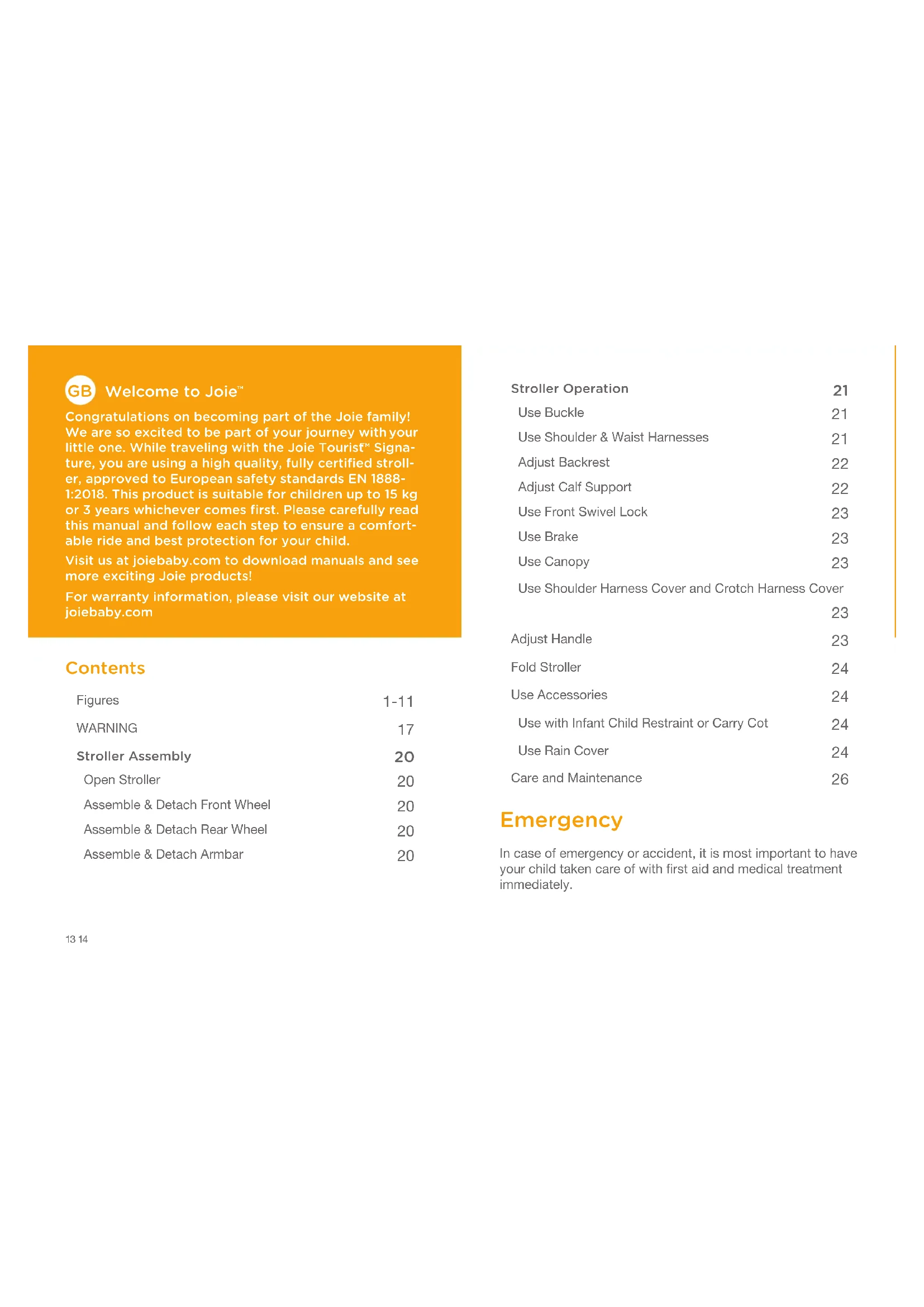 Congratulations on becoming part of the Joie family! We are so excited to be part of your journey with your little one. While traveling with the Joie Tourist ™ Signa- ture, you are using a high quality, fully certified stroll- er, approved to European safety standards EN 1888- 1:2018. This product is suitable for children up to 15 kg or 3 years whichever comes first. Please carefully read this manual and follow each step to ensure a comfort- able ride and best protection for your child. Visit us at joiebaby.com to download manuals and see more exciting Joie products! For warranty information, please visit our website at joiebaby.com Contents Figures 1-11 WARNING