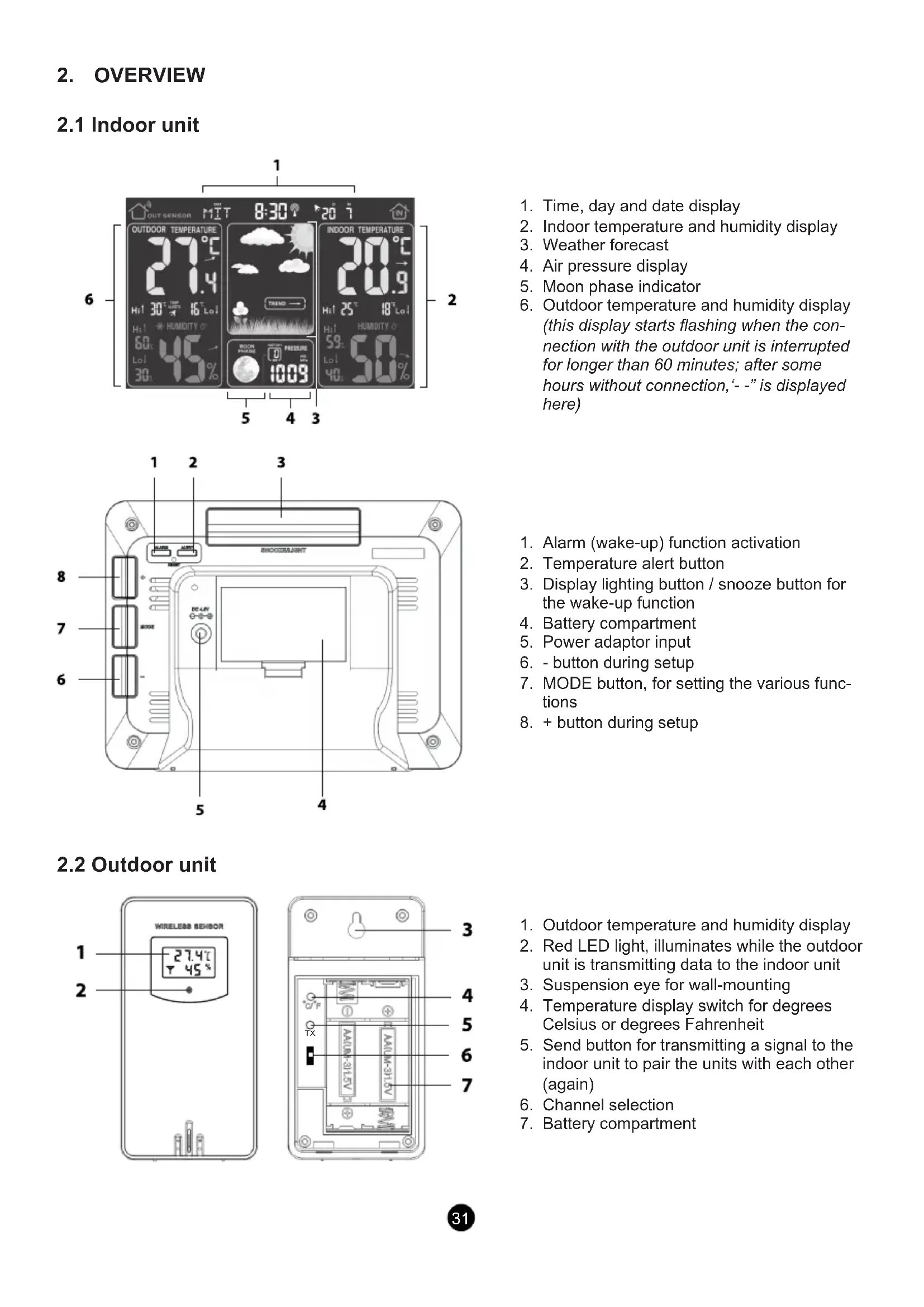 Indoor unit: The indoor unit is powered by the supplied power adaptor with model number XY06J- 0500150Q-EW. Connect this power adaptor to the rear of the indoor unit (see 6) and insert the adaptor into a 230V wall socket. At the rear of the indoor unit, remove the battery cover and install 2x AA 1.5V penlight batteries according to the markings inside the battery compartment. Replace the battery cover onto the indoor unit. Outdoor unit: Remove the battery cover from the outdoor unit by sliding it somewhat downwards and then taking it o. Install 2x AA 1.5V penlight alkaline batteries according to the markings inside the battery compartment. Replace the cover onto the outdoor unit and slide it somewhat upwards. Batteries are not included. Advice regarding the batteries for the outdoor unit: Because normal alkaline batteries do not perform or do not perform well at temperatures around or below 0°C, the use of standard alkaline batteries in the outdoor unit is not recommended. For the outdoor unit, we therefore recommend installing Lithium batteries that have been designed to function at a tempera- ture range of -20°C to 60°C. These batteries are available through the service department of Alecto via internet www.alecto.info The lifespan of Lithium batteries with a capacity of 2900mAh is well over a year.