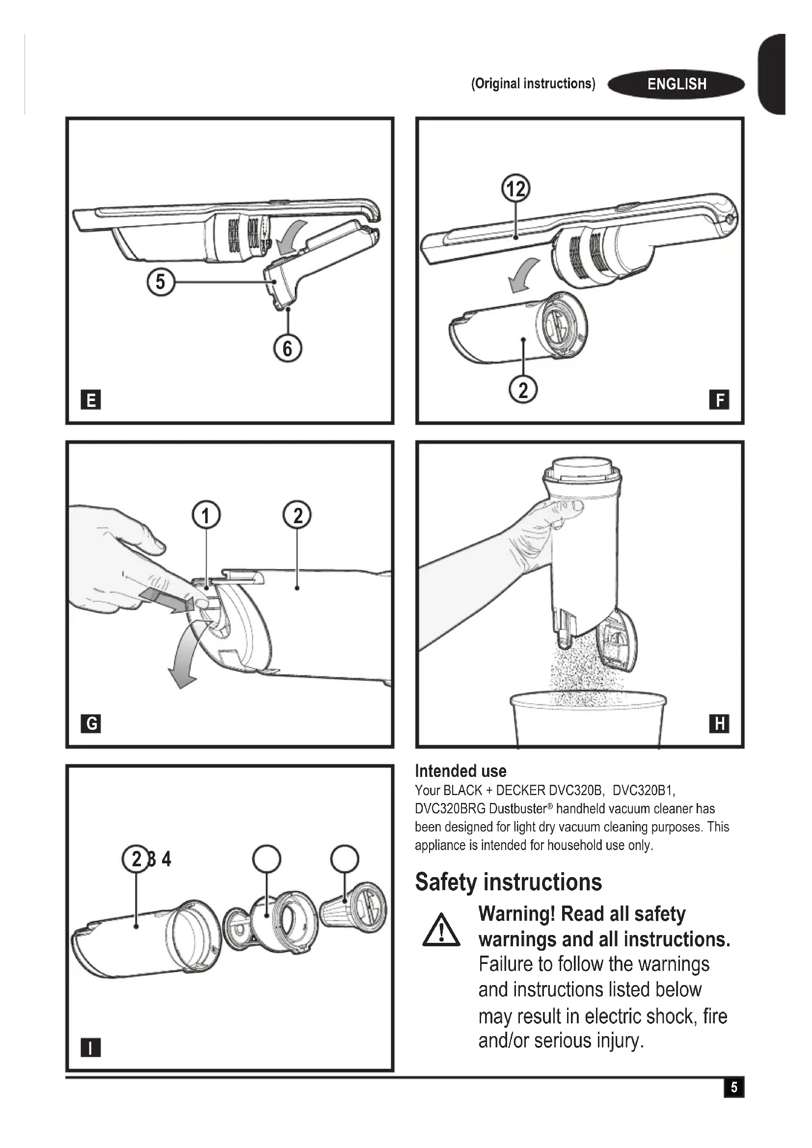 Intended use Your BLACK + DECKER DVC320B, DVC320B1, DVC320BRG Dustbuster handheld vacuum cleaner has been designed for light dry vacuum cleaning purposes. This appliance is intended for household use only. Safety instructions