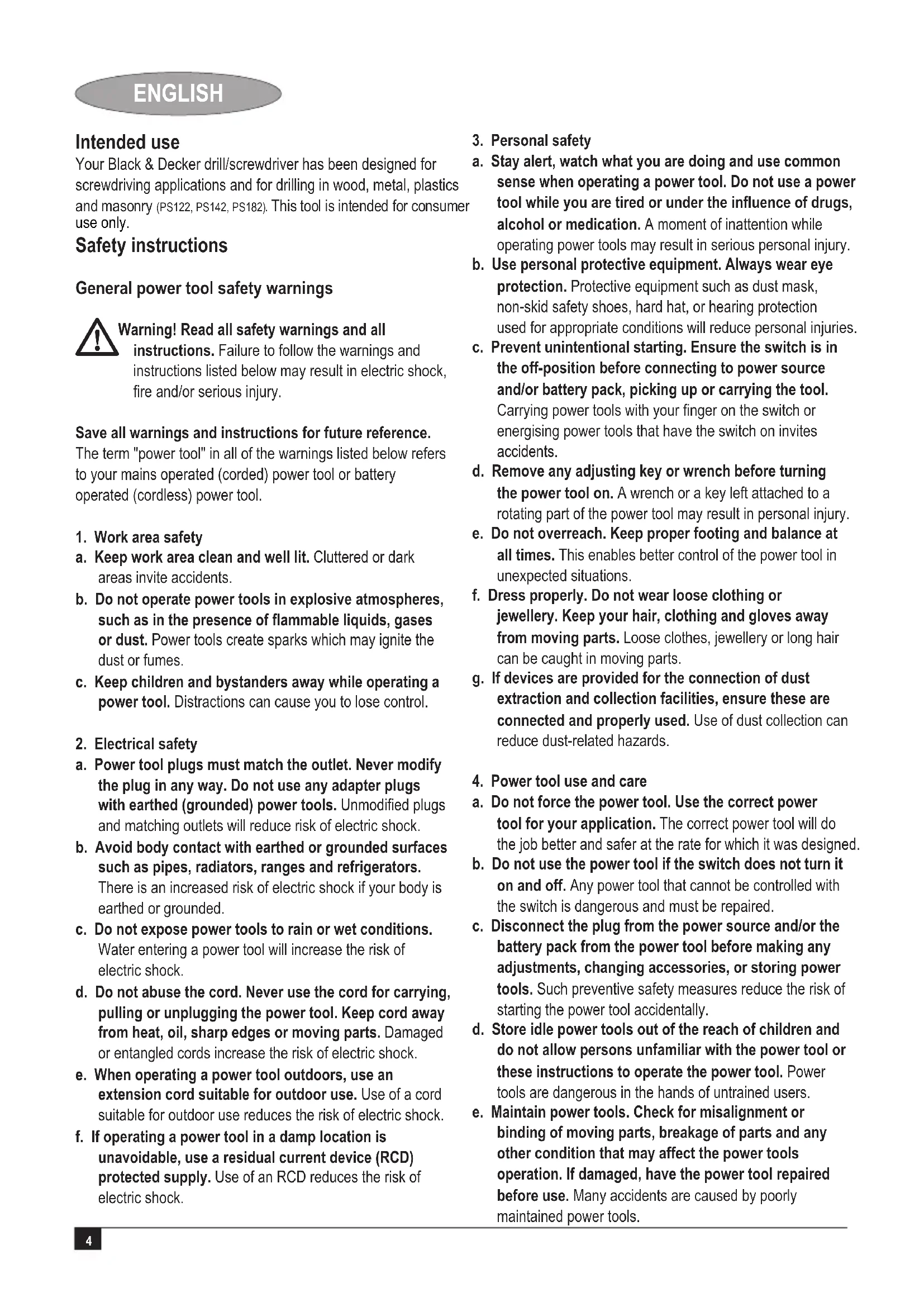 a. Do not force the power tool. Use the correct power tool for your application. The correct power tool will do the job better and safer at the rate for which it was designed. b. Do not use the power tool if the switch does not turn it on and off. Any power tool that cannot be controlled with the switch is dangerous and must be repaired. c. Disconnect the plug from the power source and/or the battery pack from the power tool before making any adjustments, changing accessories, or storing power tools. Such preventive safety measures reduce the risk of starting the power tool accidentally. d. Store idle power tools out of the reach of children and do not allow persons unfamiliar with the power tool or these instructions to operate the power tool. Power tools are dangerous in the hands of untrained users. e. Maintain power tools. Check for misalignment or binding of moving parts, breakage of parts and any other condition that may affect the power tools operation. If damaged, have the power tool repaired before use. Many accidents are caused by poorly maintained power tools. Intended use Your Black & Decker drill/screwdriver has been designed for screwdriving applications and for drilling in wood, metal, plastics and masonry (PS122, PS142, PS182). This tool is intended for consumer Safety instructions General power tool safety warnings