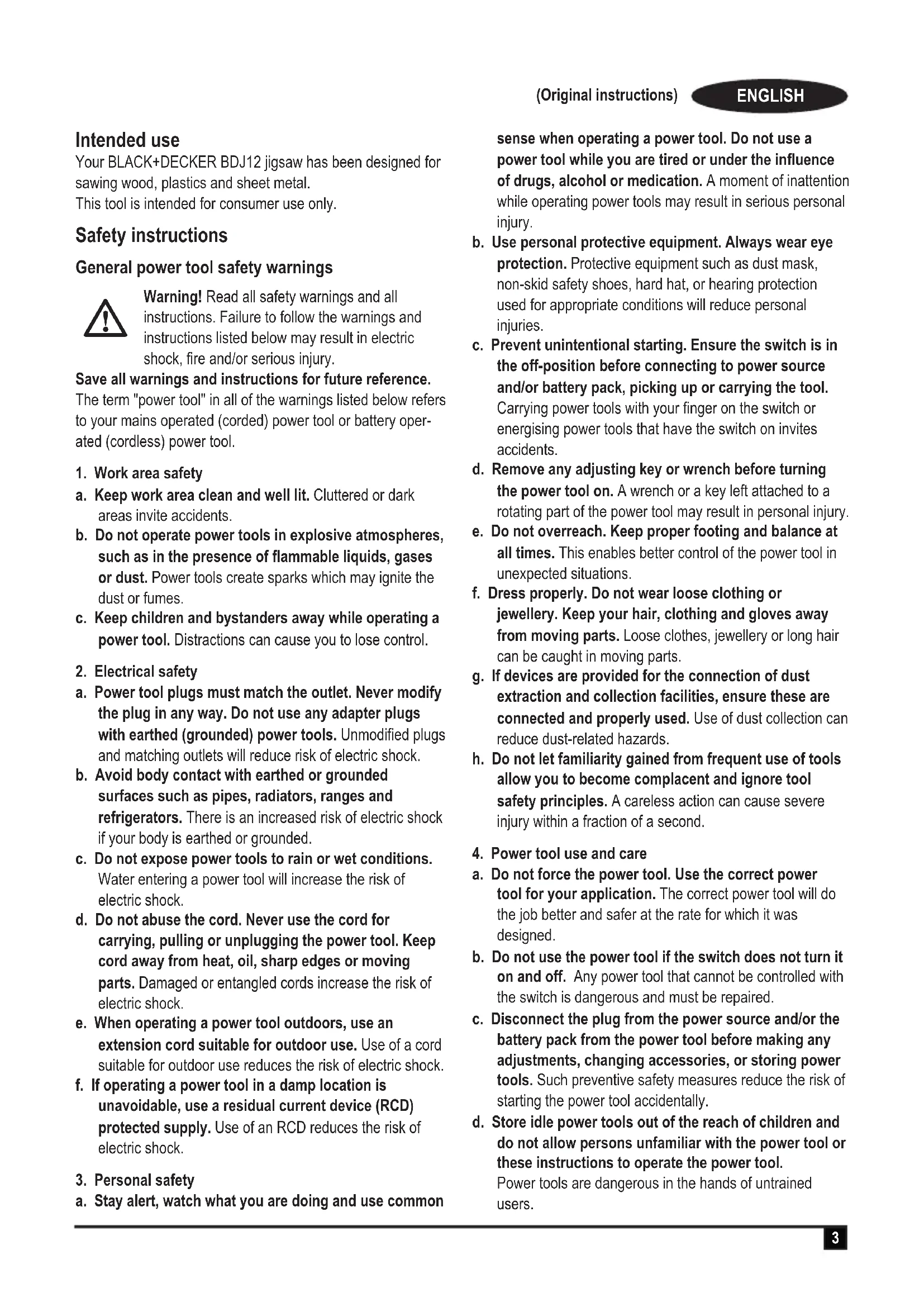 Intended use Your BLACK+DECKER BDJ12 jigsaw has been designed for sawing wood, plastics and sheet metal. This tool is intended for consumer use only. Safety instructions General power tool safety warnings