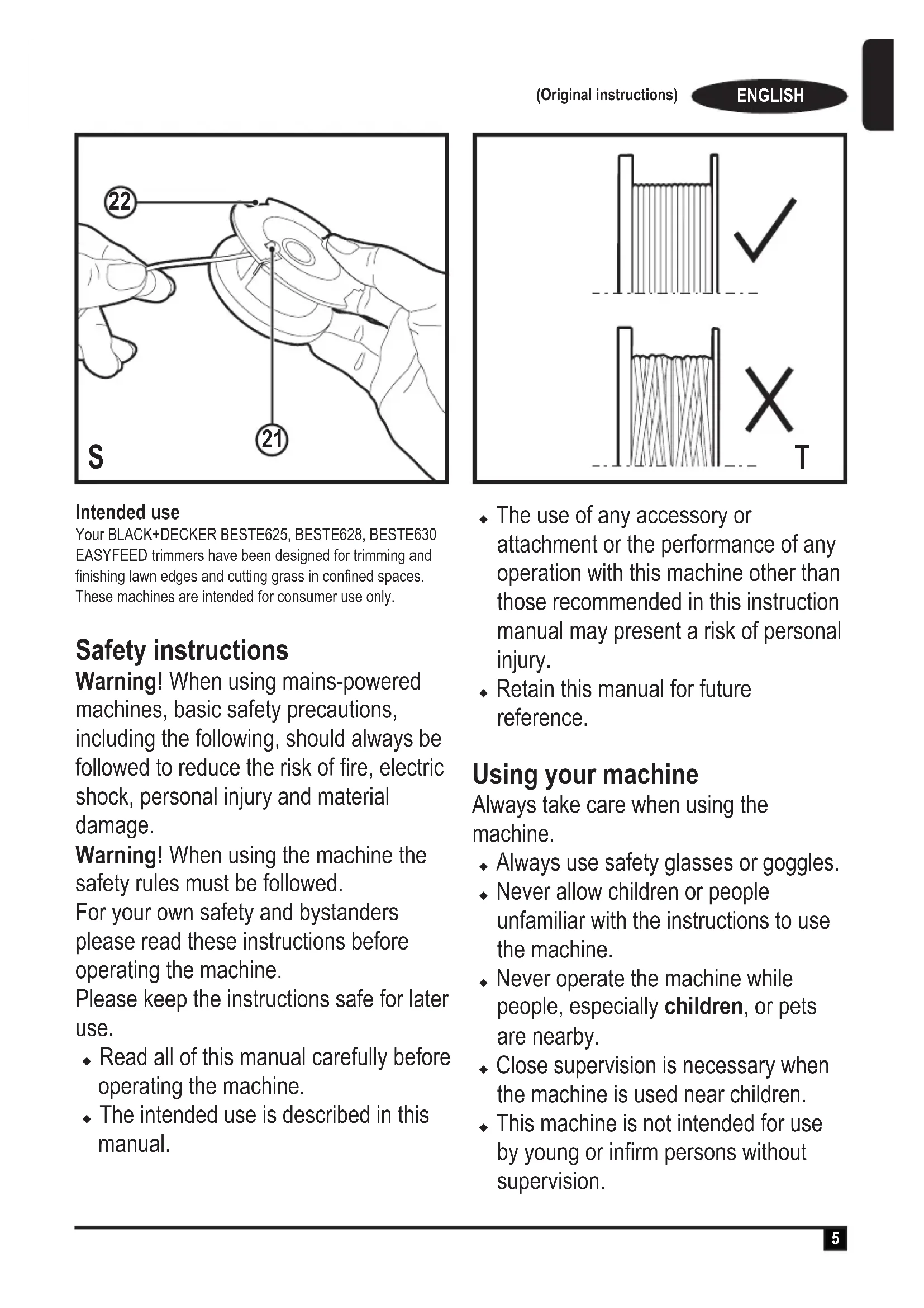 Intended use Your BLACK+DECKER BESTE625, BESTE628, BESTE630 EASYFEED trimmers have been designed for trimming and nishing lawn edges and cutting grass in conned spaces. These machines are intended for consumer use only. Safety instructions Warning! When using mains-powered machines, basic safety precautions, including the following, should always be followed to reduce the risk of re, electric shock, personal injury and material damage. Warning! When using the machine the safety rules must be followed. For your own safety and bystanders please read these instructions before operating the machine. Please keep the instructions safe for later use. Read all of this manual carefully before operating the machine. The intended use is described in this manual. The use of any accessory or attachment or the performance of any operation with this machine other than those recommended in this instruction manual may present a risk of personal injury. Retain this manual for future reference. Using your machine Always take care when using the machine. Always use safety glasses or goggles. Never allow children or people unfamiliar with the instructions to use the machine. Never operate the machine while people, especially children, or pets are nearby. Close supervision is necessary when the machine is used near children. This machine is not intended for use by young or inrm persons without supervision.
