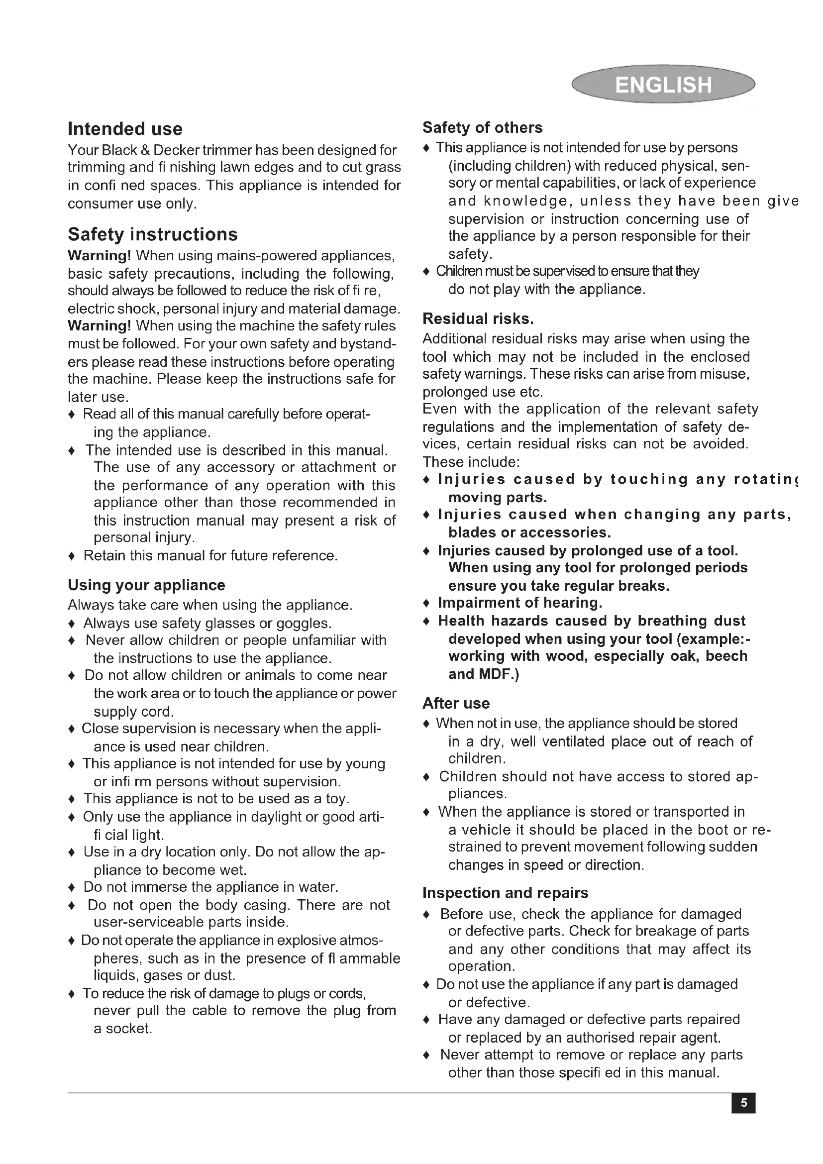 HO5VV-F extension cable can be used without loss of product performance. Before use, inspect the extension cable for signs of damage, wear and ageing. Replace the extension cable if damaged or defective. When using a cable reel, always unwind the cable completely. Additional safety instructions for grass trimmers Warning! Cutting elements continue to rotate after the motor is switched off. ♦ Be familiar with the controls and the proper use of the appliance. ♦ Before use, check the power supply cord and extension cord for signs of damage, ageing and wear. If a cord becomes damaged during use, disconnect the cord from the mains sup- ply immediately. DO NOT TOUCH THE CORD BEFORE DISCONNECTING THE SUPPLY. ♦ Do not use the appliance if the cords are dam- aged or worn. ♦ Wear stout shoes or boots to protect your feet. ♦ Wear long trousers to protect your legs. ♦ Before using the appliance, check that your cutting path is free from sticks, stones, wire and any other obstacles. ♦ Only use the appliance in the upright position, with the cutting line near the ground. Never switch the appliance on in any other position. ♦ Move slowly when using the appliance. Be aware that freshly cut grass is damp and slip- pery. ♦ Do not work on steep slopes. Work across the face of slopes, not up and down. ♦ Never cross gravel paths or roads while the appliance is running. ♦ Never touch the cutting line while the appliance is running. ♦ Do not put the appliance down until the cutting line has come to a complete standstill. ♦ Use only the appropriate type of cutting line. Never use metal cutting line or fi shing line. ♦ Be careful not to touch the line trimming blade. ♦ Take care to keep the mains cable away from the cutting line. Always be aware of the position of the cable. ♦ Keep hands and feet away from the cutting line at all times, especially when switching on the motor. ♦ Before using the appliance and after any impact, check for signs of wear or damage and repair as necessary. ♦ Never operate the appliance with damaged guards or without guards in place. ♦ Take care against injury from any device fi tted for trimming the fi lament line length. After extending new cutter line always return the machine to its normal operating position before switching on. ♦ Always ensure that the ventilation slots are kept clear of debris. ♦ Do not use the lawn trimmer (edge trimmer), if the cords are damaged or worn. ♦ Keep extension cords away from cutting ele- ments. Labels on appliance The following warning symbols are found on the appliance: Read the manual prior to operation. Wear safety glasses or goggles when oper- ating this appliance. Wear suitable ear protectors when operating this appliance. Always remove the plug from the socket before inspecting a damaged cable. Be careful not to use your strimmer if the cable is damaged. Beware of fl ying objects. Keep bystanders away from the cutting area. Do not expose the appliance to rain or high humidity. Directive 2000/14/EC guaranteed sound power. Electrical safety This appliance is double insulated; therefore no earth wire is required. Always check that the power supply corresponds to the voltage on the rating plate. ♦ If the supply cord is damaged, it must be re- placed by the manufacturer or an authorised Black & Decker Service Centre in order to avoid a hazard. ENGLISH7 ♦ Electric safety can be further improved by us- ing a high-sensitivity 30 mA Residual Current Device (RCD). Features This appliance includes some or all of the following features.