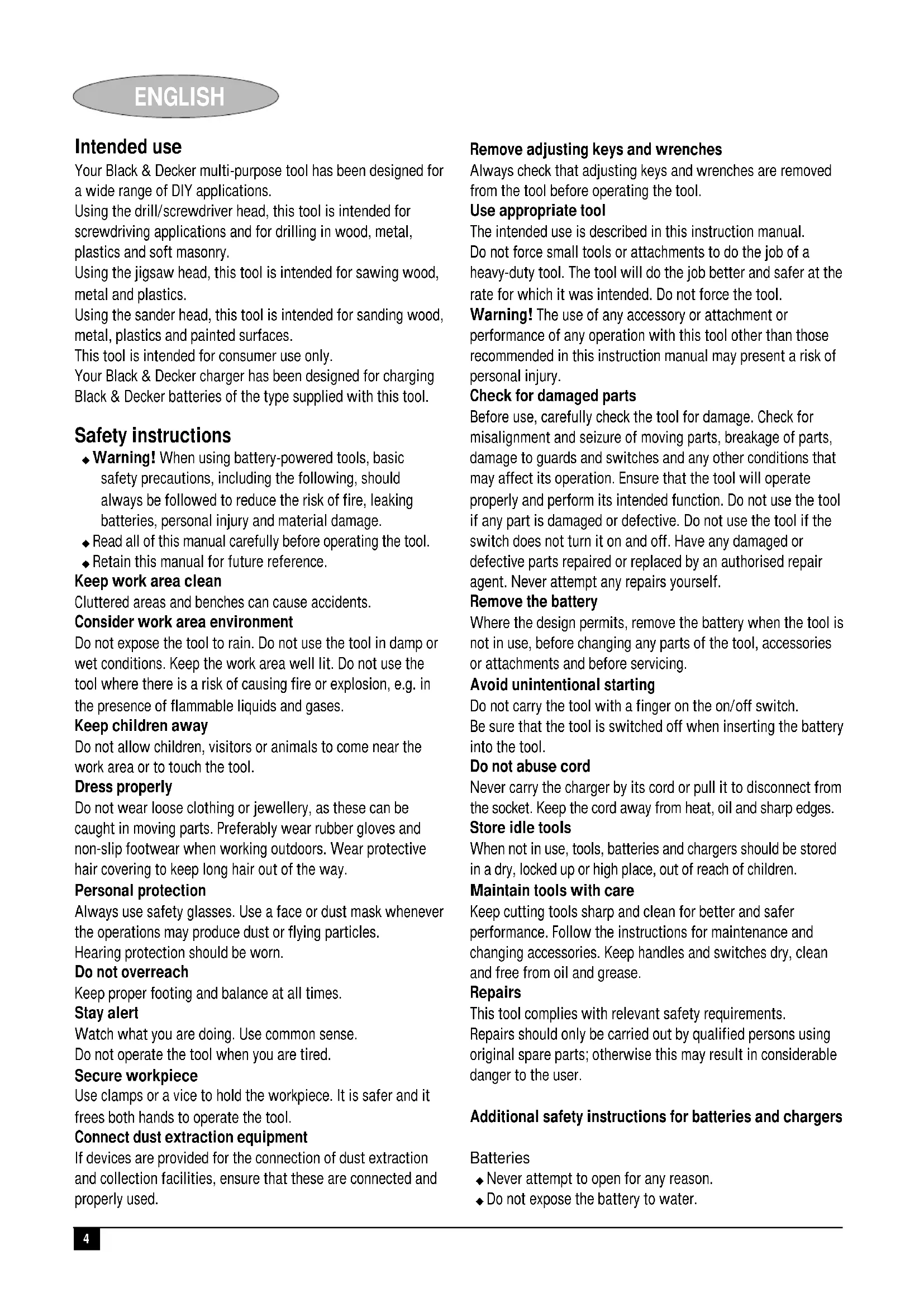 ENGLISH Intended use Your Black & Decker multi-purpose tool has been designed for a wide range of DIY applications. Using the drill/screwdriver head, this tool is intended for screwdriving applications and for drilling in wood, metal, plastics and soft masonry. Using the jigsaw head, this tool is intended for sawing wood, metal and plastics. Using the sander head, this tool is intended for sanding wood, metal, plastics and painted surfaces. This tool is intended for consumer use only. Your Black & Decker charger has been designed for charging Black & Decker batteries of the type supplied with this tool. Safety instructions ◆ Warning! When using battery-powered tools, basic safety precautions, including the following, should always be followed to reduce the risk of fire, leaking batteries, personal injury and material damage. ◆ Read all of this manual carefully before operating the tool. ◆ Retain this manual for future reference. Keep work area clean Cluttered areas and benches can cause accidents. Consider work area environment Do not expose the tool to rain. Do not use the tool in damp or wet conditions. Keep the work area well lit. Do not use the tool where there is a risk of causing fire or explosion, e.g. in the presence of flammable liquids and gases. Keep children away Do not allow children, visitors or animals to come near the work area or to touch the tool. Dress properly Do not wear loose clothing or jewellery, as these can be caught in moving parts. Preferably wear rubber gloves and non-slip footwear when working outdoors. Wear protective hair covering to keep long hair out of the way. Personal protection Always use safety glasses. Use a face or dust mask whenever the operations may produce dust or flying particles. Hearing protection should be worn. Do not overreach Keep proper footing and balance at all times. Stay alert Watch what you are doing. Use common sense. Do not operate the tool when you are tired. Secure workpiece Use clamps or a vice to hold the workpiece. It is safer and it frees both hands to operate the tool. Connect dust extraction equipment If devices are provided for the connection of dust extraction and collection facilities, ensure that these are connected and properly used. Remove adjusting keys and wrenches Always check that adjusting keys and wrenches are removed from the tool before operating the tool. Use appropriate tool The intended use is described in this instruction manual. Do not force small tools or attachments to do the job of a heavy-duty tool. The tool will do the job better and safer at the rate for which it was intended. Do not force the tool. Warning! The use of any accessory or attachment or performance of any operation with this tool other than those recommended in this instruction manual may present a risk of personal injury. Check for damaged parts Before use, carefully check the tool for damage. Check for misalignment and seizure of moving parts, breakage of parts, damage to guards and switches and any other conditions that may affect its operation. Ensure that the tool will operate properly and perform its intended function. Do not use the tool if any part is damaged or defective. Do not use the tool if the switch does not turn it on and off. Have any damaged or defective parts repaired or replaced by an authorised repair agent. Never attempt any repairs yourself. Remove the battery Where the design permits, remove the battery when the tool is not in use, before changing any parts of the tool, accessories or attachments and before servicing. Avoid unintentional starting Do not carry the tool with a finger on the on/off switch. Be sure that the tool is switched off when inserting the battery into the tool. Do not abuse cord Never carry the charger by its cord or pull it to disconnect from the socket. Keep the cord away from heat, oil and sharp edges. Store idle tools When not in use, tools, batteries and chargers should be stored in a dry, locked up or high place, out of reach of children. Maintain tools with care Keep cutting tools sharp and clean for better and safer performance. Follow the instructions for maintenance and changing accessories. Keep handles and switches dry, clean and free from oil and grease. Repairs This tool complies with relevant safety requirements. Repairs should only be carried out by qualified persons using original spare parts; otherwise this may result in considerable danger to the user. Additional safety instructions for batteries and chargers Batteries ◆ Never attempt to open for any reason. ◆ Do not expose the battery to water.5 ENGLISH ◆ Do not store in locations where the temperature may exceed 40 °C. ◆ Charge only at ambient temperatures between 4 °C and 40 °C. ◆ Charge only using the charger provided with the tool. ◆ When disposing of batteries, follow the instructions given in the section “Protecting the environment”. ◆ Under extreme conditions, battery leakage may occur. When you notice liquid on the battery, proceed as follows: - Carefully wipe the liquid off using a cloth. Avoid skin contact. - In case of skin or eye contact, follow the instructions below. Warning! The battery fluid, a 25-30% solution of potassium hydroxide, can be harmful. In case of skin contact, immediately rinse with water. Neutralise with a mild acid such as lemon juice or vinegar. In case of eye contact, rinse abundantly with clean water for at least 10 minutes. Consult a physician. Fire hazard! Avoid short-circuiting the contacts of a detached battery (e.g. when storing the battery in a toolbox). Do not incinerate the battery. Do not attempt to charge damaged batteries. Chargers ◆ Use your Black & Decker charger only to charge batteries of the type supplied with your tool. Other batteries could burst, causing personal injury and damage. ◆ Never attempt to charge non-rechargeable batteries. ◆ Have defective cords replaced immediately. ◆ Do not expose to water. ◆ Do not open the charger.