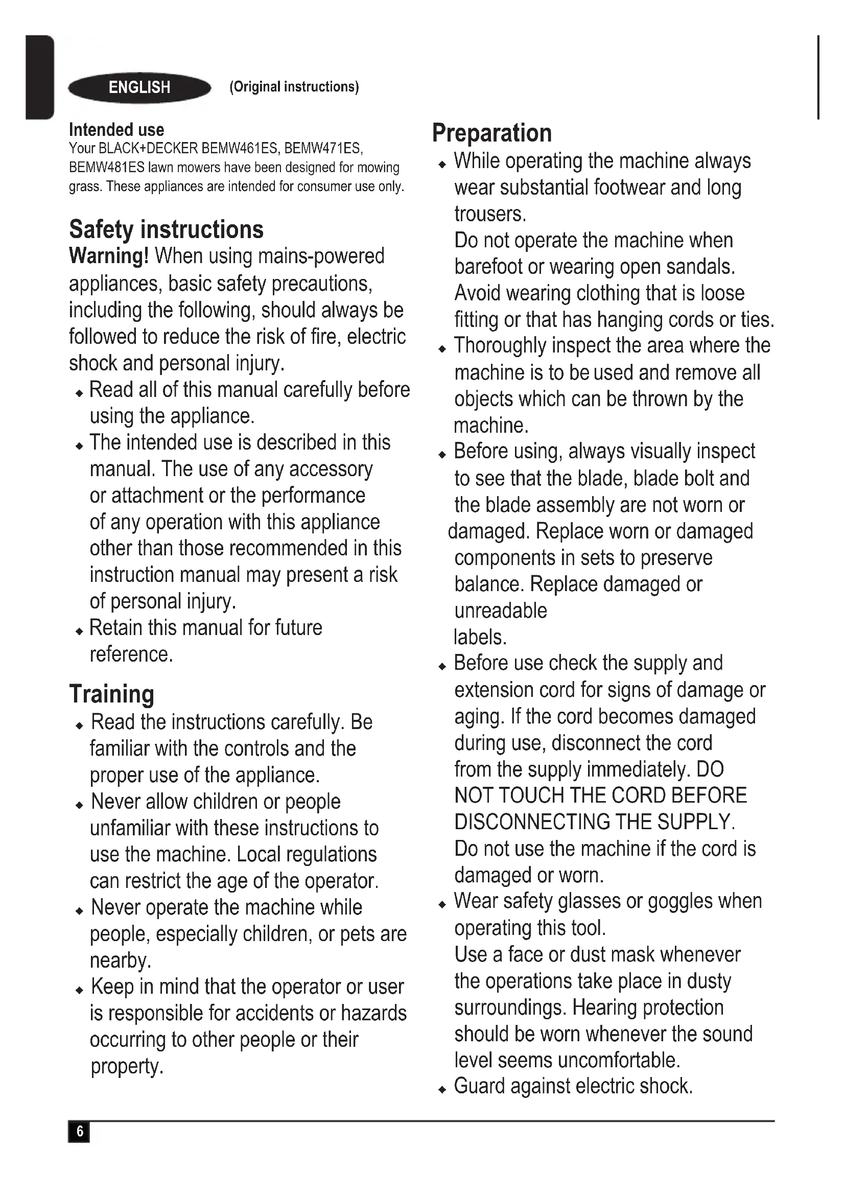 ENGLISH (Original instructions)7 ENGLISH (Original instructions) Intended use Your BLACK+DECKER BEMW461ES, BEMW471ES, BEMW481ES lawn mowers have been designed for mowing grass. These appliances are intended for consumer use only. Safety instructions Warning! When using mains-powered appliances, basic safety precautions, including the following, should always be followed to reduce the risk of re, electric shock and personal injury. u Read all of this manual carefully before using the appliance. u The intended use is described in this manual. The use of any accessory or attachment or the performance of any operation with this appliance other than those recommended in this instruction manual may present a risk of personal injury. u Retain this manual for future reference. Training u Read the instructions carefully. Be familiar with the controls and the proper use of the appliance. u Never allow children or people unfamiliar with these instructions to use the machine. Local regulations can restrict the age of the operator. u Never operate the machine while people, especially children, or pets are nearby. u Keep in mind that the operator or user is responsible for accidents or hazards occurring to other people or their property. Preparation u While operating the machine always wear substantial footwear and long trousers. Do not operate the machine when barefoot or wearing open sandals. Avoid wearing clothing that is loose tting or that has hanging cords or ties. u Thoroughly inspect the area where the machine is to be used and remove all objects which can be thrown by the machine. u Before using, always visually inspect to see that the blade, blade bolt and the blade assembly are not worn or damaged. Replace worn or damaged components in sets to preserve balance. Replace damaged or unreadable labels. u Before use check the supply and extension cord for signs of damage or aging. If the cord becomes damaged during use, disconnect the cord from the supply immediately. DO