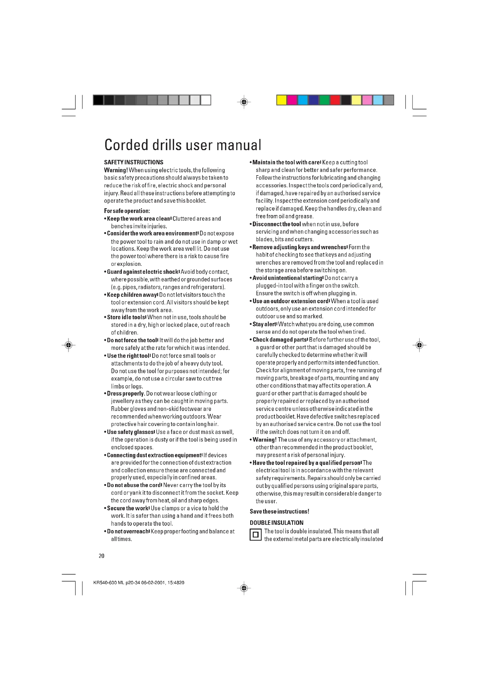 - Have the tool repaired by a qualified person. The electrical tool is in accordance with the relevant safety requirements. Repairs should only be carried out by qualified persons using original spare parts, otherwise, this may result in considerable danger to the user. Save these instructions! DOUBLE INSULATION The tool is double insulated. This means that all the external metal parts are electrically insulated Corded drills user manual KR540-600 ML p20-34 06-02-2001, 15:482021 ENGLISH from the mains power supply. This is done by placing insulation barriers between the electrical and mechanical components making it unnecessary for the tool to be earthed. Note: Double insulation does not take the place of normal safety precautions when operating the tool. The insulation system is for added protection against injury resulting from a possible electrical insulation failure within the tool. ELECTRICAL SAFETY Be sure the supply is the same as the voltage given on the rating plate. The tool is fitted with a two-core cable and plug. MAINS PLUG REPLACEMENT (UK ONLY) Should the mains plug need replacing and you are competent to do this, proceed as instructed below. If you are in doubt, contact a Black & Decker service centre or a qualified electrician.