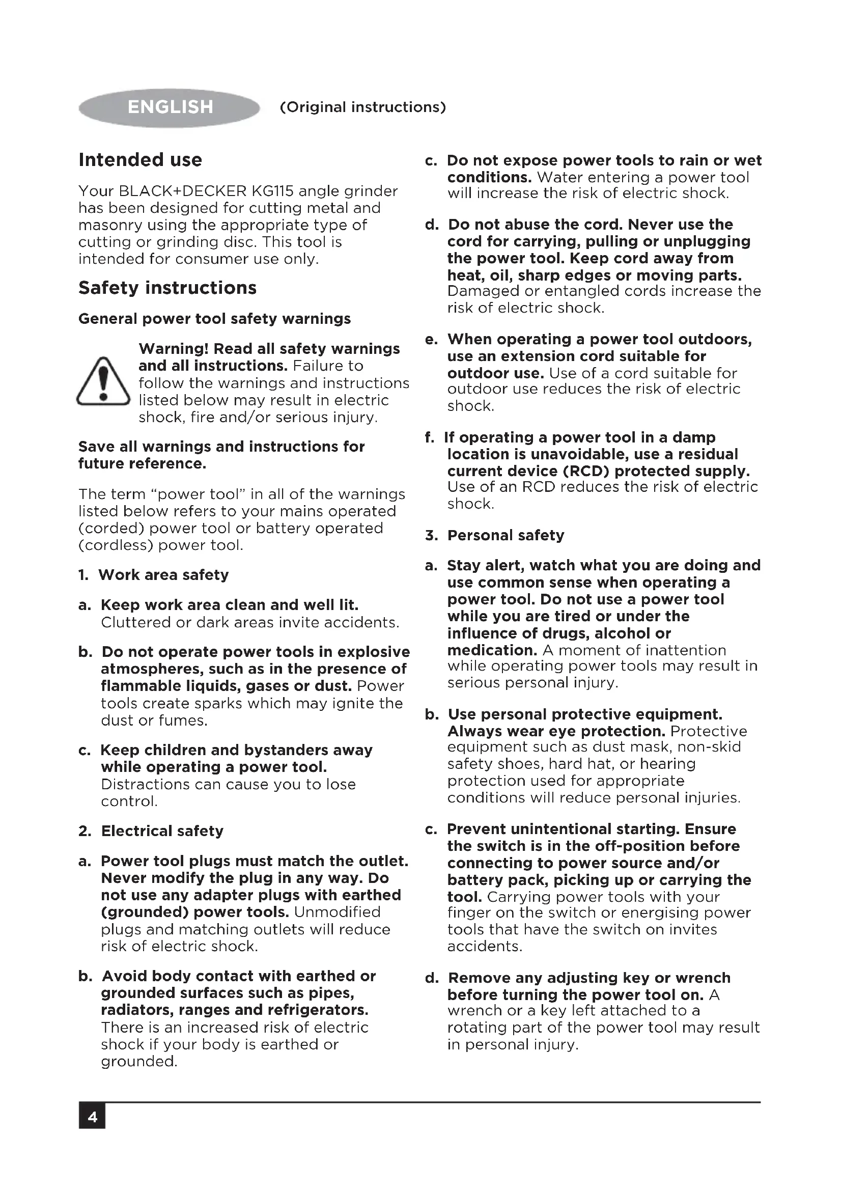 ENGLISH (Original instructions) Intended use Your BLACK+DECKER KG115 angle grinder has been designed for cutting metal and masonry using the appropriate type of cutting or grinding disc. This tool is intended for consumer use only. Safety instructions General power tool safety warnings Warning! Read all safety warnings and all instructions. Failure to follow the warnings and instructions listed below may result in electric shock, fire and/or serious injury. Save all warnings and instructions for future reference. The term “power tool” in all of the warnings listed below refers to your mains operated (corded) power tool or battery operated (cordless) power tool.