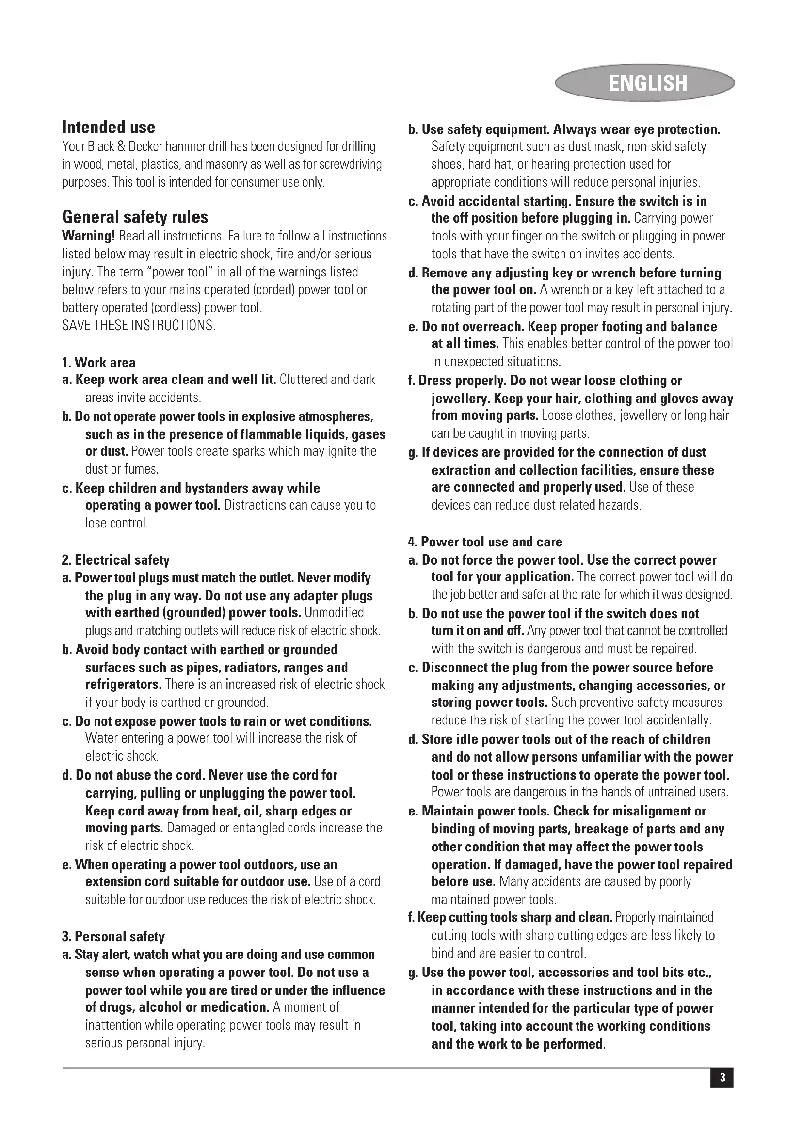 ENGLISH Intended use Your Black & Decker hammer drill has been designed for drilling in wood, metal, plastics, and masonry as well as for screwdriving purposes. This tool is intended for consumer use only. General safety rules Warning! Read all instructions. Failure to follow all instructions listed below may result in electric shock, fire and/or serious injury. The term “power tool” in all of the warnings listed below refers to your mains operated (corded) power tool or battery operated (cordless) power tool. SAVE THESE INSTRUCTIONS.