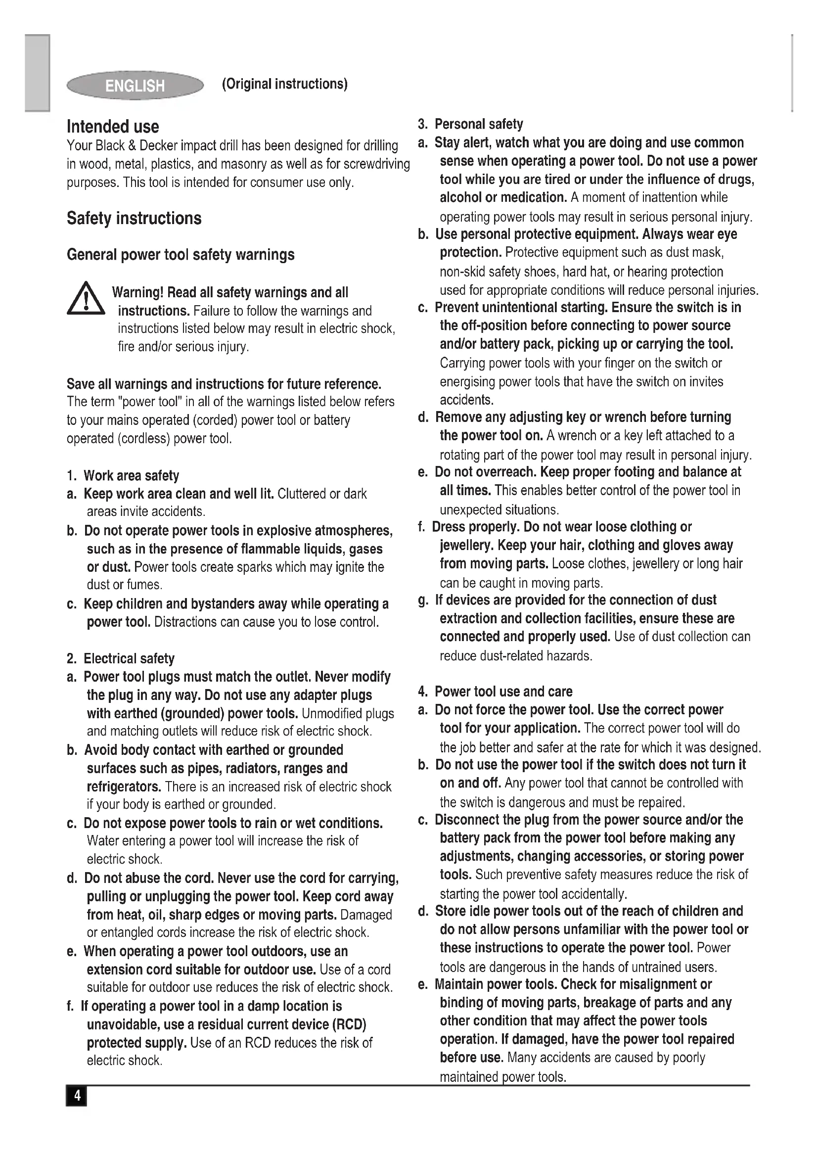 a. Do not force the power tool. Use the correct power tool for your application. The correct power tool will do the job better and safer at the rate for which it was designed. b. Do not use the power tool if the switch does not turn it on and off. Any power tool that cannot be controlled with the switch is dangerous and must be repaired. c. Disconnect the plug from the power source and/or the battery pack from the power tool before making any adjustments, changing accessories, or storing power tools. Such preventive safety measures reduce the risk of starting the power tool accidentally. d. Store idle power tools out of the reach of children and do not allow persons unfamiliar with the power tool or these instructions to operate the power tool. Power tools are dangerous in the hands of untrained users. e. Maintain power tools. Check for misalignment or binding of moving parts, breakage of parts and any other condition that may affect the power tools operation. If damaged, have the power tool repaired before use. Many accidents are caused by poorly maintained power tools. Intended use Your Black & Decker impact drill has been designed for drilling in wood, metal, plastics, and masonry as well as for screwdriving purposes. This tool is intended for consumer use only. Safety instructions General power tool safety warnings