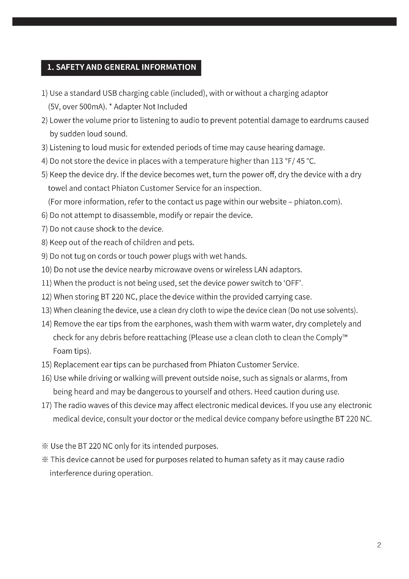WIRELESS EARPHONES with ACTIVE NOISE CANCELLING Thank you for purchasing PHIATON BT 220 NC - Please follow the directions, and read the guidelines carefully before use (Please, keep the owner’s guide for future reference). - Some functions of the BT 220 NC may not be available when it is paired with certain devices. Contents