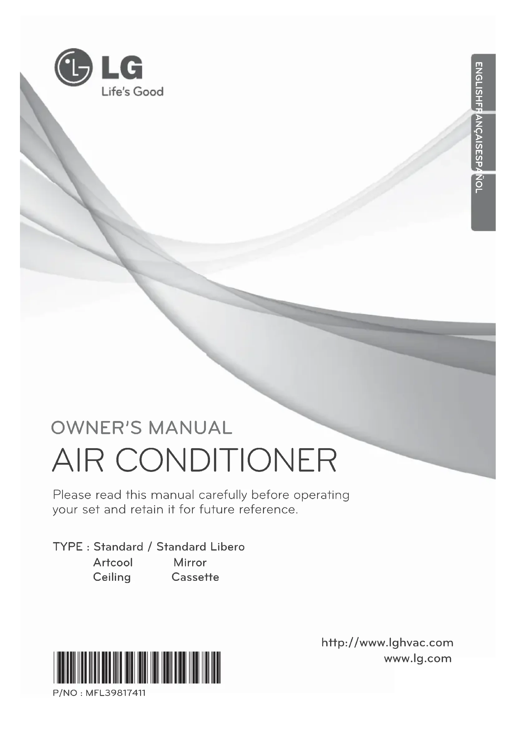 AIR CONDITIONER Please read this manual carefully before operating your set and retain it for future reference. TYPE : Standard / Standard Libero Artcool Mirror Ceiling Cassette http://www.lghvac.com www.lg.com P/NO : MFL39817411ENGLISH FRANÇAIS ESPAÑOL2 Multi Air Conditioner Multi-Type Air Conditioner Owner’s Manual