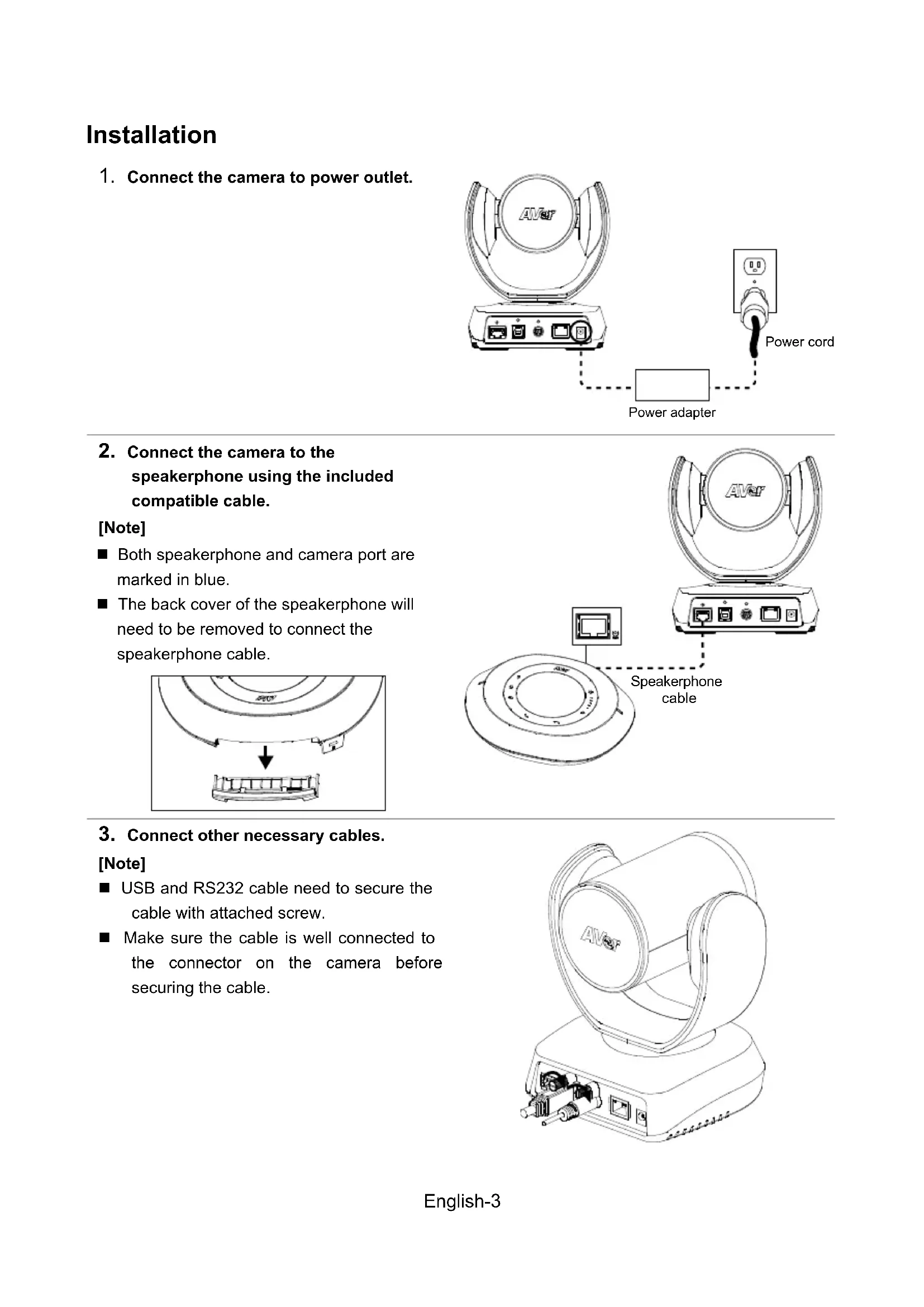 [Note] USB and RS232 cable need to secure the cable with attached screw. Make sure the cable is well connected to the connector on the camera before securing the cable. English-4