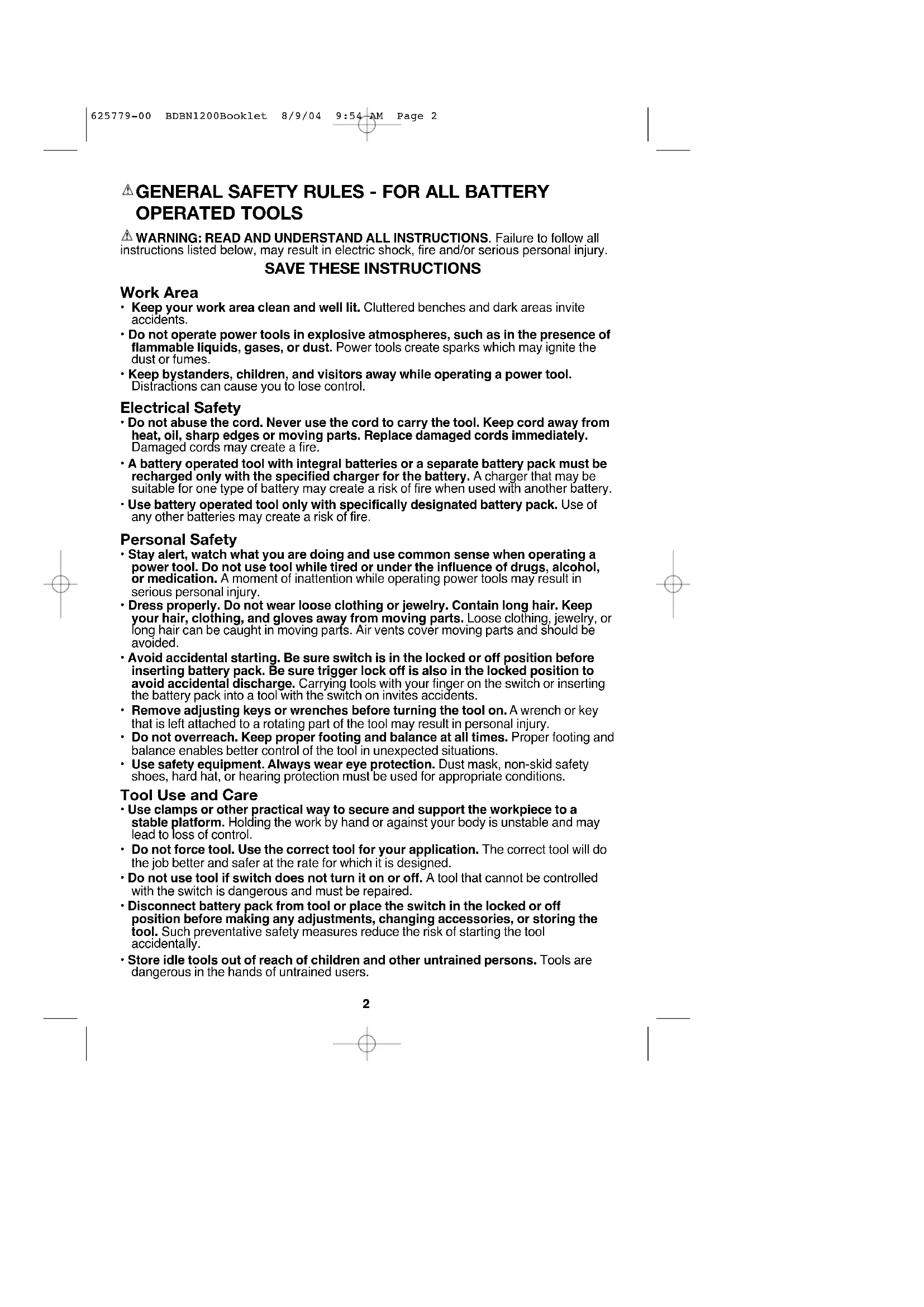 improper extension cord could result in a risk of fire, electric shock or electrocution. a. Two-wire cords can be used with 2-wire or 3-wire extension cords. Only round jacketed extension cords should be used, and we recommend that they be listed by Underwriters Laboratories (U.L.). If the extension is to be used outside, the cord must be suitable for outdoor use. Any cord marked for outdoor use can also be used for indoor work. The letters "W" or "WA" on the cord jacket indicate that the cord is suitable for outdoor use. b. An extension cord must have adequate wire size (AWG or American Wire Gauge) for safety, and to prevent loss of power and overheating. The smaller the gauge number of the wire, the greater the capacity of the cable; that is, 16 gauge has more capacity than 18 gauge. When using more than one extension to make up the total length, be sure each extension contains at least the minimum wire size. Battery Cap 625779-00 BDBN1200Booklet 8/9/04 9:55 AM Page 56