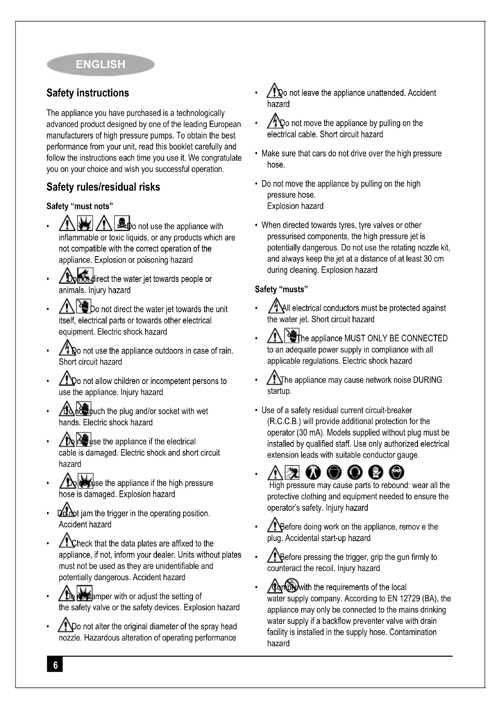 NCNOC6 ENGLISH Safety instructions The appliance you have purchased is a technologically advanced product designed by one of the leading European manufacturers of high pressure pumps. To obtain the best performance from your unit, read this booklet carefully and follow the instructions each time you use it. We congratulate you on your choice and wish you successful operation. Safety rules/residual risks Safety “must nots”