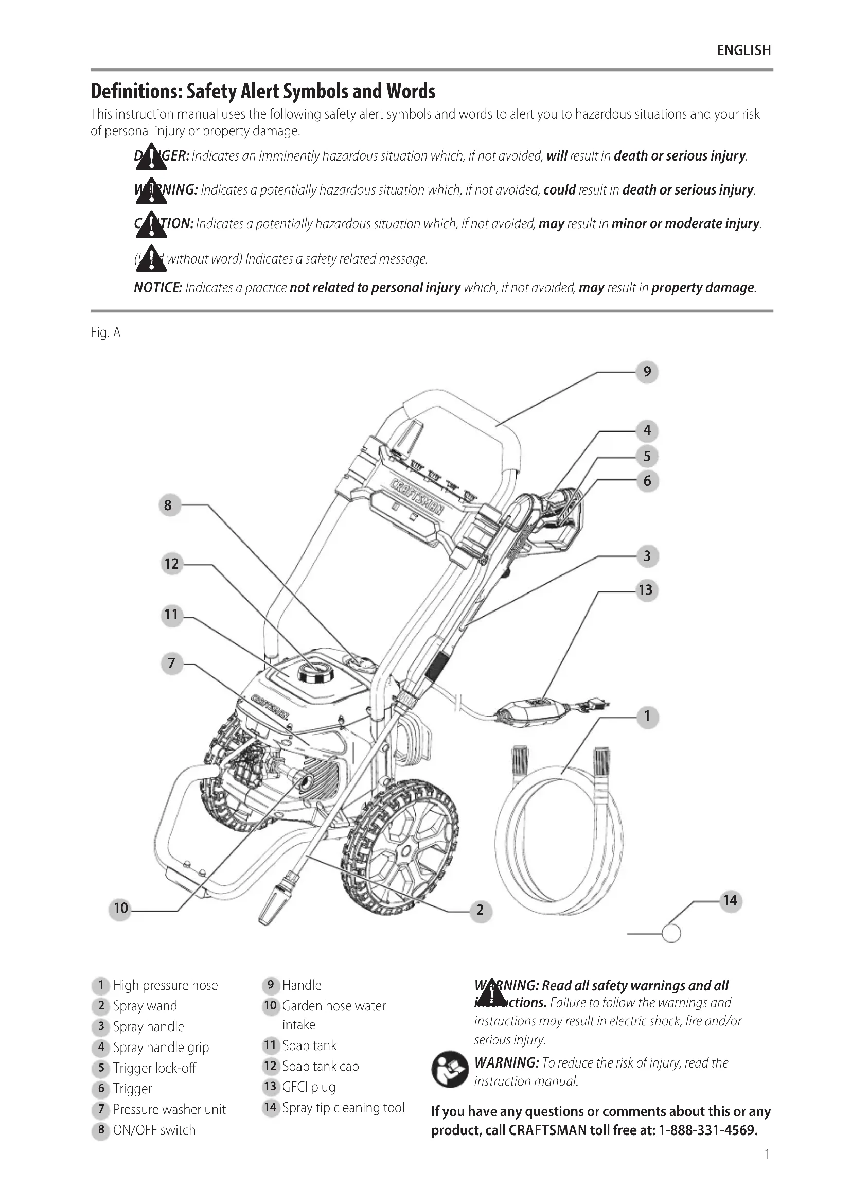 ENGLISH Test Ground-Fault Circuit-Interrupter (GFCI) Before Each Use (FIg. A) This pressure washer is provided with a ground-fault circuit- interrupter (GFCI) built into the plug of the power-supply cord. This device provides additional protection from the risk of electricshock.