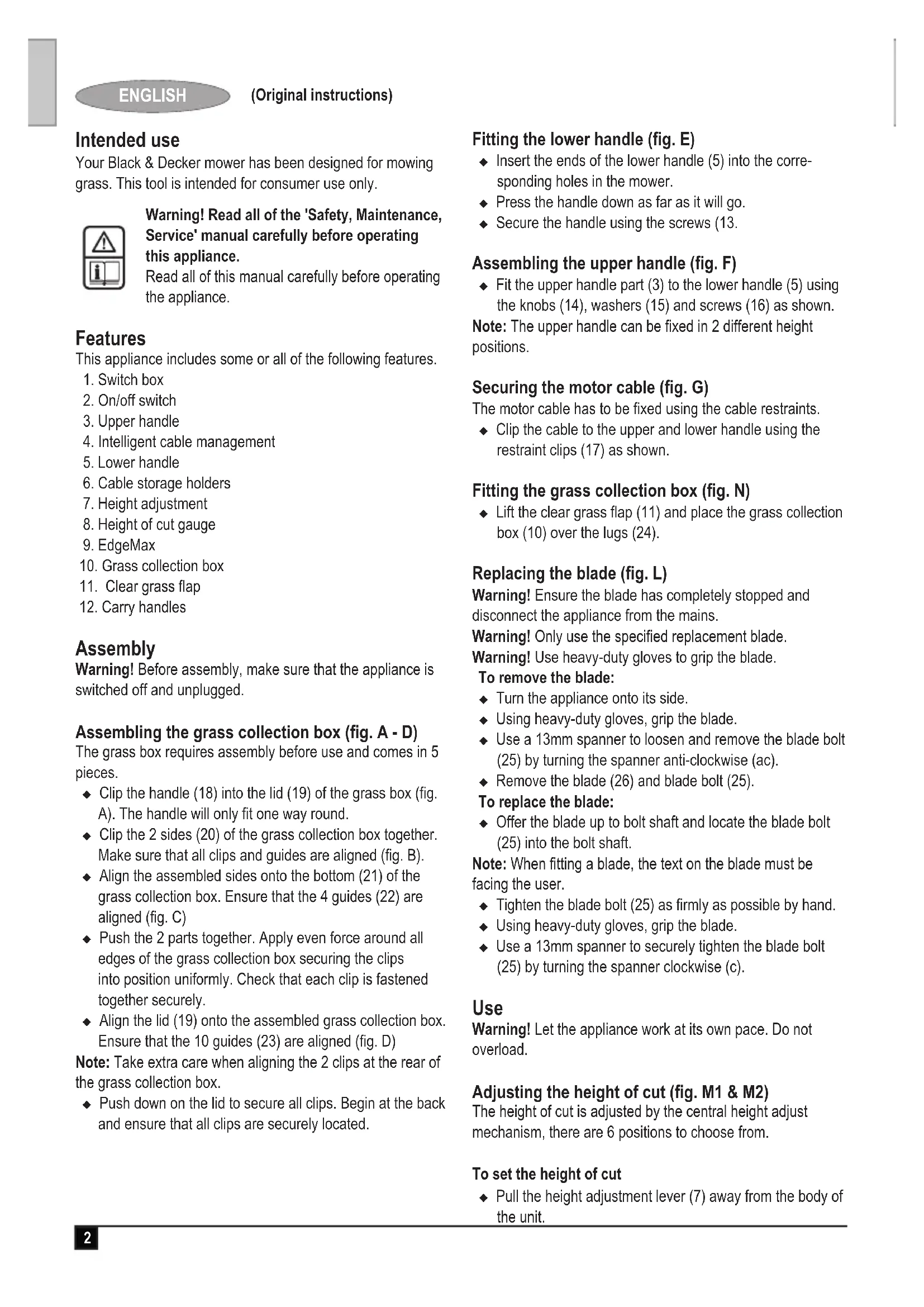Assembly Warning! Before assembly, make sure that the appliance is switched off and unplugged. Assembling the grass collection box (g. A - D) The grass box requires assembly before use and comes in 5 pieces. u Clip the handle (18) into the lid (19) of the grass box (g. A). The handle will only t one way round. u Clip the 2 sides (20) of the grass collection box together. Make sure that all clips and guides are aligned (g. B). u Align the assembled sides onto the bottom (21) of the grass collection box. Ensure that the 4 guides (22) are aligned (g. C) u Push the 2 parts together. Apply even force around all edges of the grass collection box securing the clips into position uniformly. Check that each clip is fastened together securely. u Align the lid (19) onto the assembled grass collection box. Ensure that the 10 guides (23) are aligned (g. D) Note: Take extra care when aligning the 2 clips at the rear of the grass collection box. u Push down on the lid to secure all clips. Begin at the back and ensure that all clips are securely located. Fitting the lower handle (g. E) u Insert the ends of the lower handle (5) into the corre- sponding holes in the mower. u Press the handle down as far as it will go. u Secure the handle using the screws (13. Assembling the upper handle (g. F) u Fit the upper handle part (3) to the lower handle (5) using the knobs (14), washers (15) and screws (16) as shown. Note: The upper handle can be xed in 2 different height positions. Securing the motor cable (g. G) The motor cable has to be xed using the cable restraints. u Clip the cable to the upper and lower handle using the restraint clips (17) as shown. Fitting the grass collection box (g. N) u Lift the clear grass ap (11) and place the grass collection box (10) over the lugs (24). Replacing the blade (g. L) Warning! Ensure the blade has completely stopped and disconnect the appliance from the mains. Warning! Only use the specied replacement blade. Warning! Use heavy-duty gloves to grip the blade. To remove the blade: u Turn the appliance onto its side. u Using heavy-duty gloves, grip the blade. u Use a 13mm spanner to loosen and remove the blade bolt (25) by turning the spanner anti-clockwise (ac). u Remove the blade (26) and blade bolt (25). To replace the blade: u Offer the blade up to bolt shaft and locate the blade bolt (25) into the bolt shaft. Note: When tting a blade, the text on the blade must be facing the user. u Tighten the blade bolt (25) as rmly as possible by hand. u Using heavy-duty gloves, grip the blade. u Use a 13mm spanner to securely tighten the blade bolt (25) by turning the spanner clockwise (c). Use Warning! Let the appliance work at its own pace. Do not overload. Adjusting the height of cut (g. M1 & M2) The height of cut is adjusted by the central height adjust mechanism, there are 6 positions to choose from. To set the height of cut u Pull the height adjustment lever (7) away from the body of the unit.3 ENGLISH (Original instructions) u Move the lever towards the rear of the appliance to lower the height of cut. u Move the lever towards the front of the appliance to raise the height of cut. u Push the height adjustment lever (7) into one of the 6 height locations. Note: The height of cut can be viewed on the height of cut gauge (8) on the side of the unit. Switching on and off (g. I) Switching on u Push in and hold the lock-off button (27). u Pull the on/off switch (2) towards the handle. u Release the lock-off button. Switching off u Release the on/off switch (2).