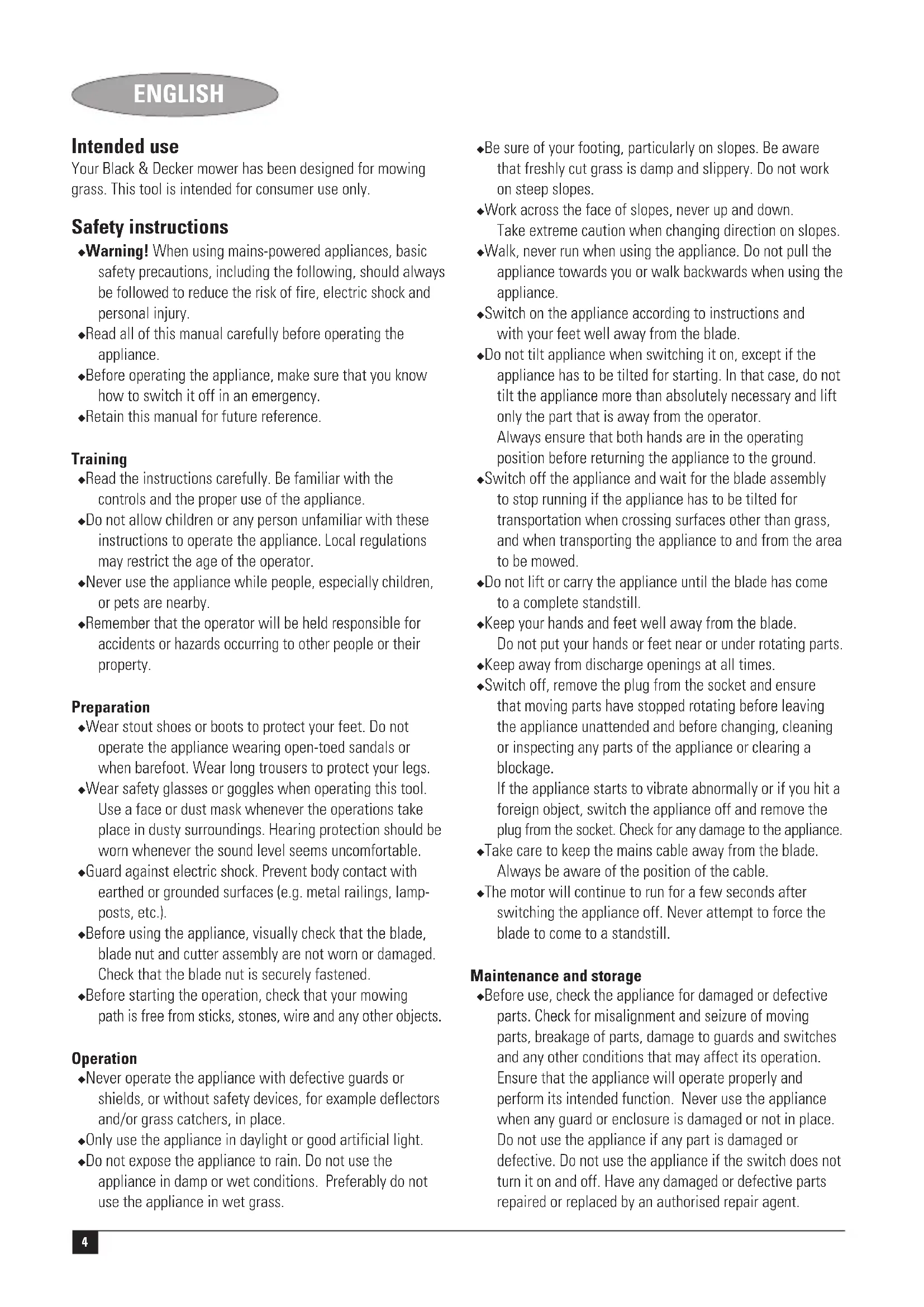 ENGLISH Intended use Your Black & Decker mower has been designed for mowing grass. This tool is intended for consumer use only. Safety instructions ◆ Warning! When using mains-powered appliances, basic safety precautions, including the following, should always be followed to reduce the risk of fire, electric shock and personal injury. ◆ Read all of this manual carefully before operating the appliance. ◆ Before operating the appliance, make sure that you know how to switch it off in an emergency. ◆ Retain this manual for future reference. Training ◆ Read the instructions carefully. Be familiar with the controls and the proper use of the appliance. ◆ Do not allow children or any person unfamiliar with these instructions to operate the appliance. Local regulations may restrict the age of the operator. ◆ Never use the appliance while people, especially children, or pets are nearby. ◆ Remember that the operator will be held responsible for accidents or hazards occurring to other people or their property. Preparation ◆ Wear stout shoes or boots to protect your feet. Do not operate the appliance wearing open-toed sandals or when barefoot. Wear long trousers to protect your legs. ◆ Wear safety glasses or goggles when operating this tool. Use a face or dust mask whenever the operations take place in dusty surroundings. Hearing protection should be worn whenever the sound level seems uncomfortable. ◆ Guard against electric shock. Prevent body contact with earthed or grounded surfaces (e.g. metal railings, lamp- posts, etc.). ◆ Before using the appliance, visually check that the blade, blade nut and cutter assembly are not worn or damaged. Check that the blade nut is securely fastened. ◆ Before starting the operation, check that your mowing path is free from sticks, stones, wire and any other objects. Operation ◆ Never operate the appliance with defective guards or shields, or without safety devices, for example deflectors and/or grass catchers, in place. ◆ Only use the appliance in daylight or good artificial light. ◆ Do not expose the appliance to rain. Do not use the appliance in damp or wet conditions. Preferably do not use the appliance in wet grass. ◆ Be sure of your footing, particularly on slopes. Be aware that freshly cut grass is damp and slippery. Do not work on steep slopes. ◆ Work across the face of slopes, never up and down. Take extreme caution when changing direction on slopes. ◆ Walk, never run when using the appliance. Do not pull the appliance towards you or walk backwards when using the appliance. ◆ Switch on the appliance according to instructions and with your feet well away from the blade. ◆ Do not tilt appliance when switching it on, except if the appliance has to be tilted for starting. In that case, do not tilt the appliance more than absolutely necessary and lift only the part that is away from the operator. Always ensure that both hands are in the operating position before returning the appliance to the ground. ◆ Switch off the appliance and wait for the blade assembly to stop running if the appliance has to be tilted for transportation when crossing surfaces other than grass, and when transporting the appliance to and from the area to be mowed. ◆ Do not lift or carry the appliance until the blade has come to a complete standstill. ◆ Keep your hands and feet well away from the blade. Do not put your hands or feet near or under rotating parts. ◆ Keep away from discharge openings at all times. ◆ Switch off, remove the plug from the socket and ensure that moving parts have stopped rotating before leaving the appliance unattended and before changing, cleaning or inspecting any parts of the appliance or clearing a blockage. If the appliance starts to vibrate abnormally or if you hit a foreign object, switch the appliance off and remove the plug from the socket. Check for any damage to the appliance. ◆ Take care to keep the mains cable away from the blade. Always be aware of the position of the cable. ◆ The motor will continue to run for a few seconds after switching the appliance off. Never attempt to force the blade to come to a standstill. Maintenance and storage ◆ Before use, check the appliance for damaged or defective parts. Check for misalignment and seizure of moving parts, breakage of parts, damage to guards and switches and any other conditions that may affect its operation. Ensure that the appliance will operate properly and perform its intended function. Never use the appliance when any guard or enclosure is damaged or not in place. Do not use the appliance if any part is damaged or defective. Do not use the appliance if the switch does not turn it on and off. Have any damaged or defective parts repaired or replaced by an authorised repair agent.5 ENGLISH ◆ Check the cable frequently for damage. If the cable is damaged, it must be replaced by an authorised repair agent in order to prevent a hazard. Inspect extension cables periodically. Replace a damaged extension cable immediately. ◆ Keep all nuts, bolts and screws on the appliance tight to ensure a safe working condition. ◆ Check the grass bag for wear or damage and replace it if necessary. Never use the appliance without the grass bag. ◆ When not in use, the appliance should be stored in a dry place. Children should not have access to stored appliances. ◆ Ensure that only replacement cutting means of the right type are used. ◆ Use only Black & Decker recommended spare parts and accessories. Warning symbols The following warning symbols are found on the appliance: Read the manual prior to operation. Do not expose the appliance to rain or high humidity.