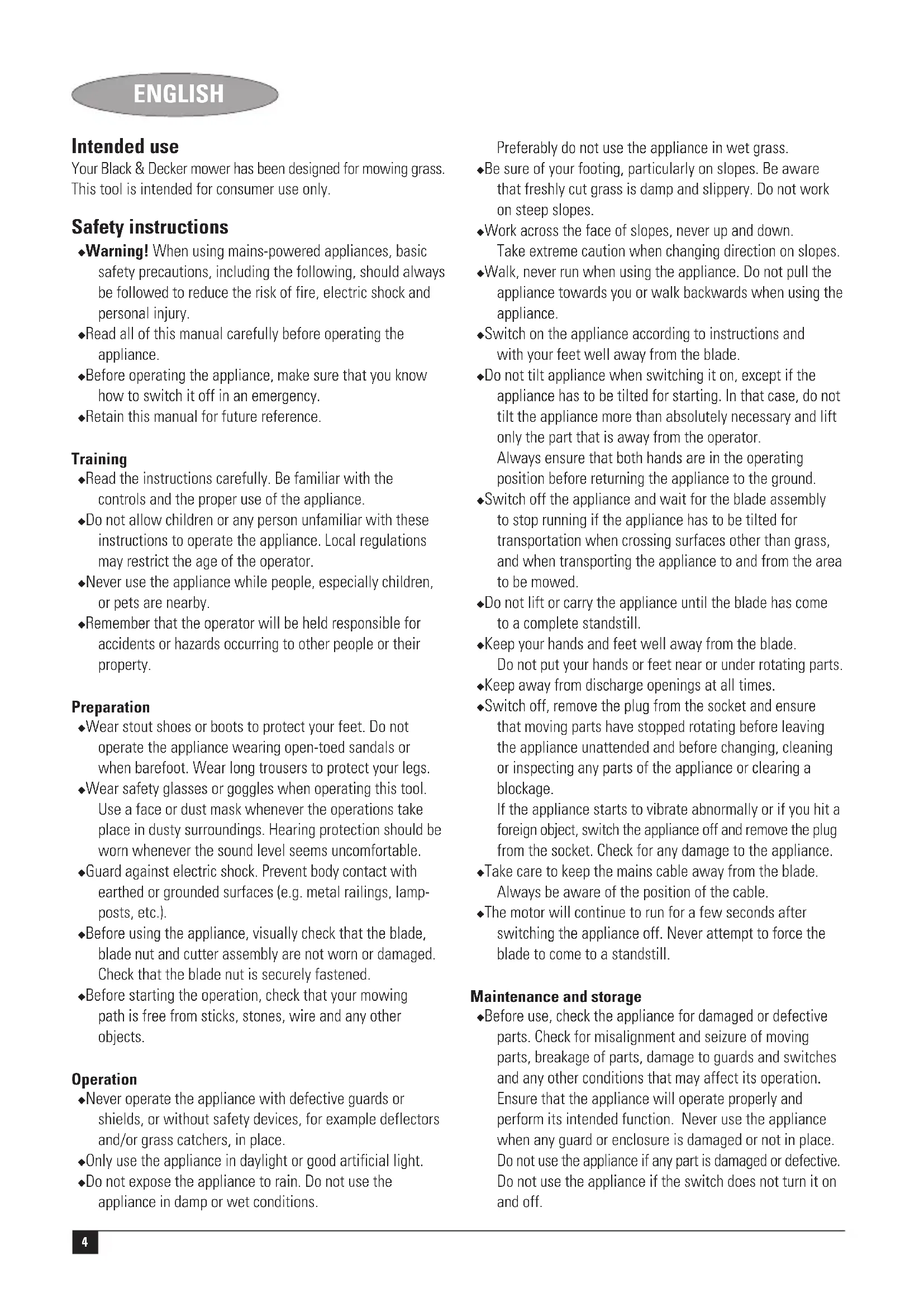 ENGLISH Intended use Your Black & Decker mower has been designed for mowing grass. This tool is intended for consumer use only. Safety instructions ◆ Warning! When using mains-powered appliances, basic safety precautions, including the following, should always be followed to reduce the risk of fire, electric shock and personal injury. ◆ Read all of this manual carefully before operating the appliance. ◆ Before operating the appliance, make sure that you know how to switch it off in an emergency. ◆ Retain this manual for future reference. Training ◆ Read the instructions carefully. Be familiar with the controls and the proper use of the appliance. ◆ Do not allow children or any person unfamiliar with these instructions to operate the appliance. Local regulations may restrict the age of the operator. ◆ Never use the appliance while people, especially children, or pets are nearby. ◆ Remember that the operator will be held responsible for accidents or hazards occurring to other people or their property. Preparation ◆ Wear stout shoes or boots to protect your feet. Do not operate the appliance wearing open-toed sandals or when barefoot. Wear long trousers to protect your legs. ◆ Wear safety glasses or goggles when operating this tool. Use a face or dust mask whenever the operations take place in dusty surroundings. Hearing protection should be worn whenever the sound level seems uncomfortable. ◆ Guard against electric shock. Prevent body contact with earthed or grounded surfaces (e.g. metal railings, lamp- posts, etc.). ◆ Before using the appliance, visually check that the blade, blade nut and cutter assembly are not worn or damaged. Check that the blade nut is securely fastened. ◆ Before starting the operation, check that your mowing path is free from sticks, stones, wire and any other objects. Operation ◆ Never operate the appliance with defective guards or shields, or without safety devices, for example deflectors and/or grass catchers, in place. ◆ Only use the appliance in daylight or good artificial light. ◆ Do not expose the appliance to rain. Do not use the appliance in damp or wet conditions. Preferably do not use the appliance in wet grass. ◆ Be sure of your footing, particularly on slopes. Be aware that freshly cut grass is damp and slippery. Do not work on steep slopes. ◆ Work across the face of slopes, never up and down. Take extreme caution when changing direction on slopes. ◆ Walk, never run when using the appliance. Do not pull the appliance towards you or walk backwards when using the appliance. ◆ Switch on the appliance according to instructions and with your feet well away from the blade. ◆ Do not tilt appliance when switching it on, except if the appliance has to be tilted for starting. In that case, do not tilt the appliance more than absolutely necessary and lift only the part that is away from the operator. Always ensure that both hands are in the operating position before returning the appliance to the ground. ◆ Switch off the appliance and wait for the blade assembly to stop running if the appliance has to be tilted for transportation when crossing surfaces other than grass, and when transporting the appliance to and from the area to be mowed. ◆ Do not lift or carry the appliance until the blade has come to a complete standstill. ◆ Keep your hands and feet well away from the blade. Do not put your hands or feet near or under rotating parts. ◆ Keep away from discharge openings at all times. ◆ Switch off, remove the plug from the socket and ensure that moving parts have stopped rotating before leaving the appliance unattended and before changing, cleaning or inspecting any parts of the appliance or clearing a blockage. If the appliance starts to vibrate abnormally or if you hit a foreign object, switch the appliance off and remove the plug from the socket. Check for any damage to the appliance. ◆ Take care to keep the mains cable away from the blade. Always be aware of the position of the cable. ◆ The motor will continue to run for a few seconds after switching the appliance off. Never attempt to force the blade to come to a standstill. Maintenance and storage ◆ Before use, check the appliance for damaged or defective parts. Check for misalignment and seizure of moving parts, breakage of parts, damage to guards and switches and any other conditions that may affect its operation. Ensure that the appliance will operate properly and perform its intended function. Never use the appliance when any guard or enclosure is damaged or not in place. Do not use the appliance if any part is damaged or defective. Do not use the appliance if the switch does not turn it on and off.5 ENGLISH Have any damaged or defective parts repaired or replaced by an authorised repair agent. ◆ Check the cable frequently for damage. If the cable is damaged, it must be replaced by an authorised repair agent in order to prevent a hazard. Inspect extension cables periodically. Replace a damaged extension cable immediately. ◆ Keep all nuts, bolts and screws on the appliance tight to ensure a safe working condition. ◆ Check the grass bag for wear or damage and replace it if necessary. Never use the appliance without the grass bag. ◆ When not in use, the appliance should be stored in a dry place. Children should not have access to stored appliances. ◆ Ensure that only replacement cutting means of the right type are used. ◆ Use only Black & Decker recommended spare parts and accessories. Warning symbols The following warning symbols are found on the appliance: Read the manual prior to operation. Do not expose the appliance to rain or high humidity. Remove the plug from the socket if the mains cable is damaged. Keep bystanders away. Remove the plug from the socket before carrying out any adjustment, servicing or maintenance. Beware of sharp edges. Keep the cable away from the cutting blades. Electrical safety The appliance must always be swi