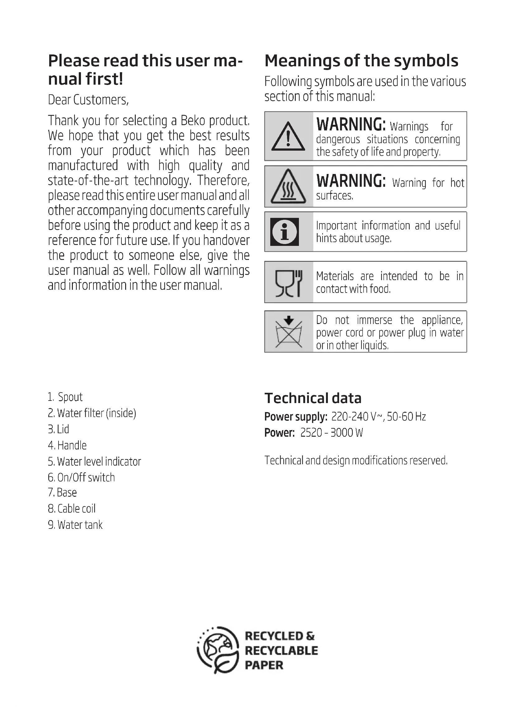 PRZYGOTOWANIE OBSŁUGA CZYSZCZENIE I KONSERWACJAPlease read ths user ma- nual frst! Dear Customers, Thank you for selectng a Beko product. We hope that you get the best results from your product whch has been manufactured wth hgh qualty and state-of-the-art technology. Therefore, please read ths entre user manual and all other accompanyng documents carefully before usng the product and keep t as a reference for future use. If you handover the product to someone else, gve the user manual as well. Follow all warnngs and nformaton n the user manual. 1. Spout2. Water filter (inside)3. Lid4. Handle5. Water level indicator6. On/Off switch7. Base 8. Cable coil9. Water tank Technical data Power supply: 220-240 V~, 50-60 HzPower: 2520 – 3000 WTechnical and design modifications reserved. Meanngs of the symbols Followng symbols are used n the varous secton of ths manual: