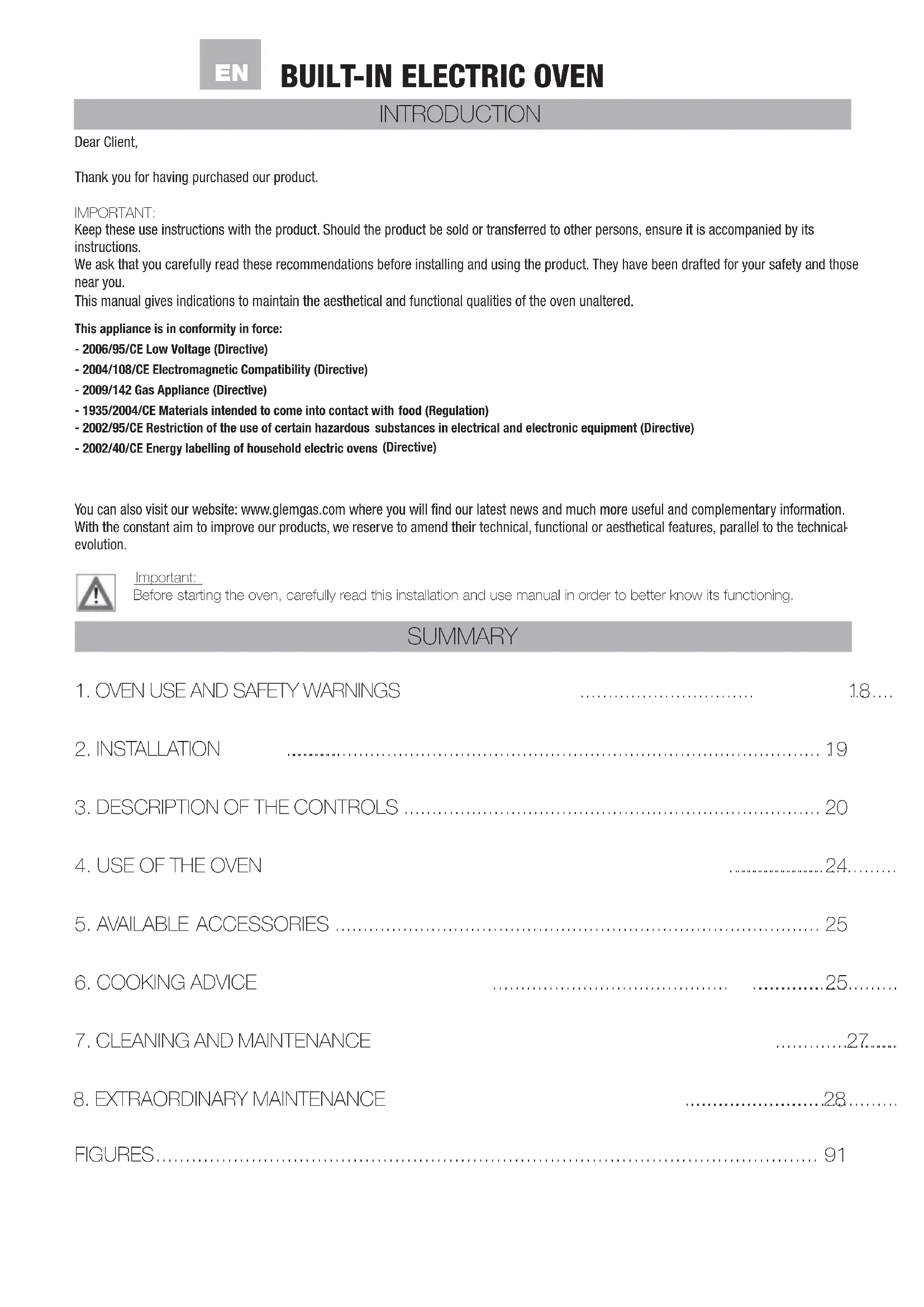 Dear Client, Thank you for having purchased our product. IMPORTANT: Keep these use instructions with the product. Should the product be sold or transferred to other persons, ensure it is accompanied by its instructions. We ask that you carefully read these recommendations before installing and using the product. They have been drafted for your safety and those near you. This manual gives indications to maintain the aesthetical and functional qualities of the oven unaltered. You can also visit our website: www.glemgas.com where you will find our latest news and much more useful and complementary information. With the constant aim to improve our products, we reserve to amend their technical, functional or aesthetical features, parallel to the technical evolution.