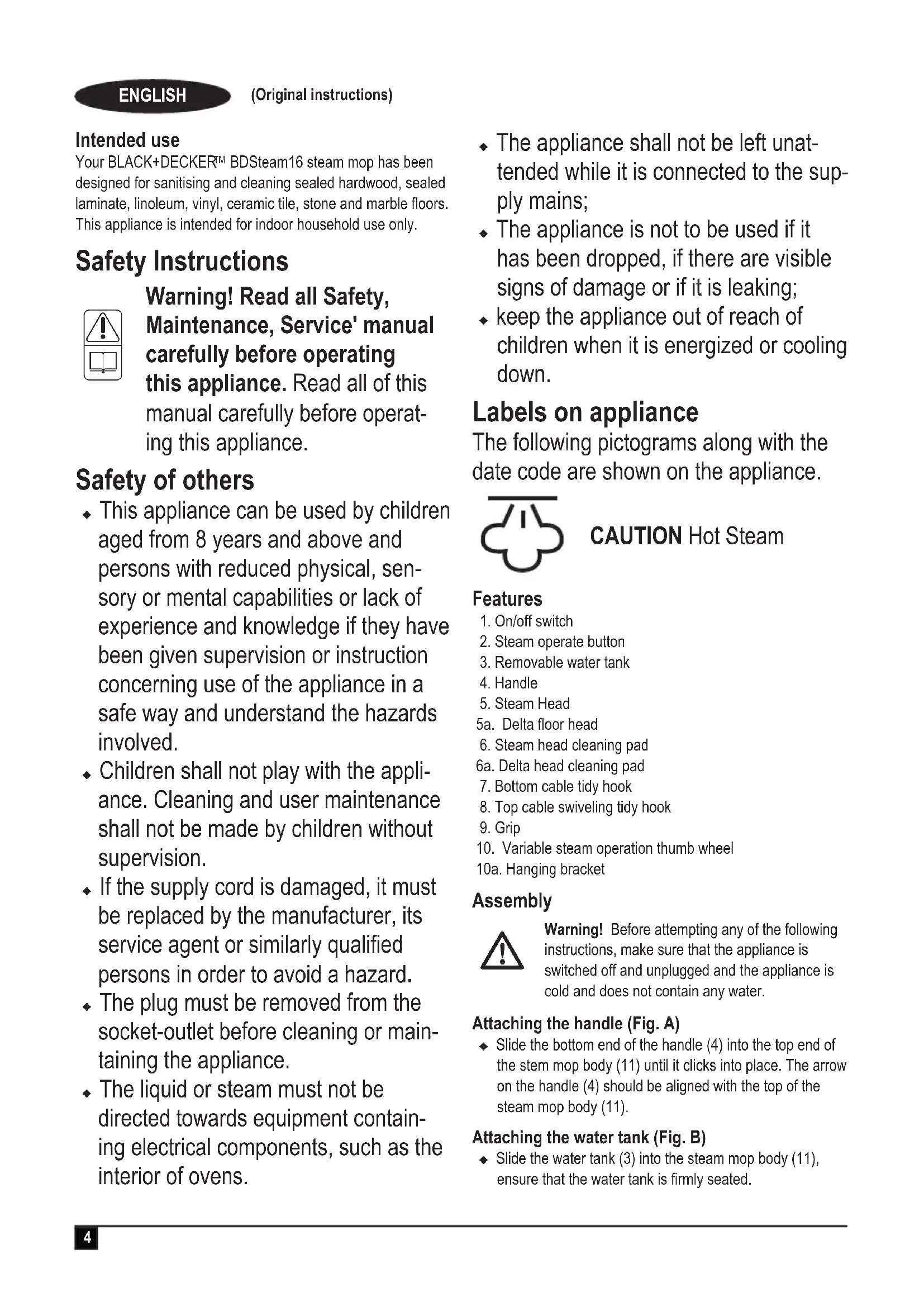 ENGLISH (Original instructions) Intended use Your BLACK+DECKER BDSteam16 steam mop has been designed for sanitising and cleaning sealed hardwood, sealed laminate, linoleum, vinyl, ceramic tile, stone and marble oors. This appliance is intended for indoor household use only. Safety Instructions