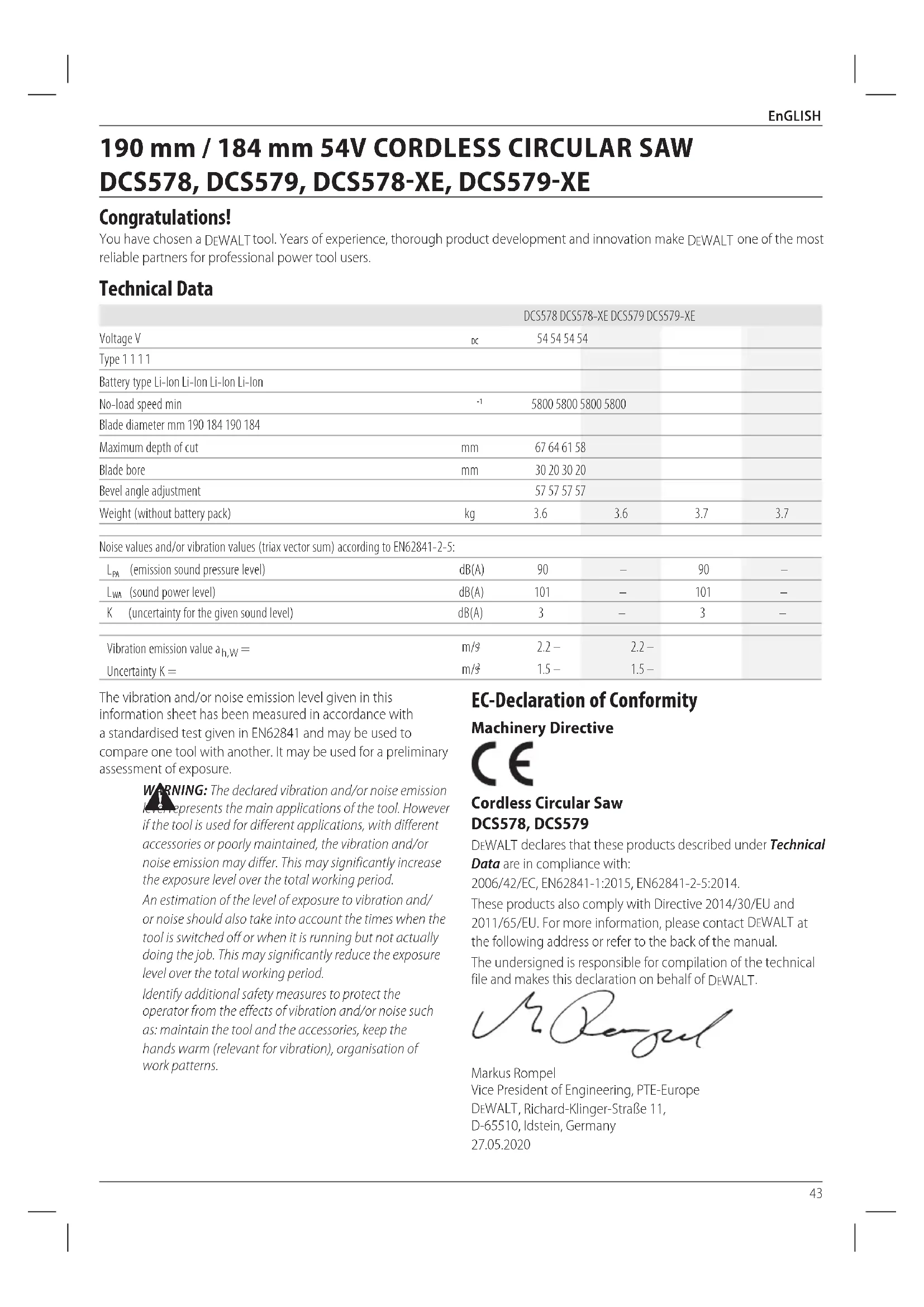 the following address or refer to the back of themanual. The undersigned is responsible for compilation of the technical file and makes this declaration on behalf of DeWALT
