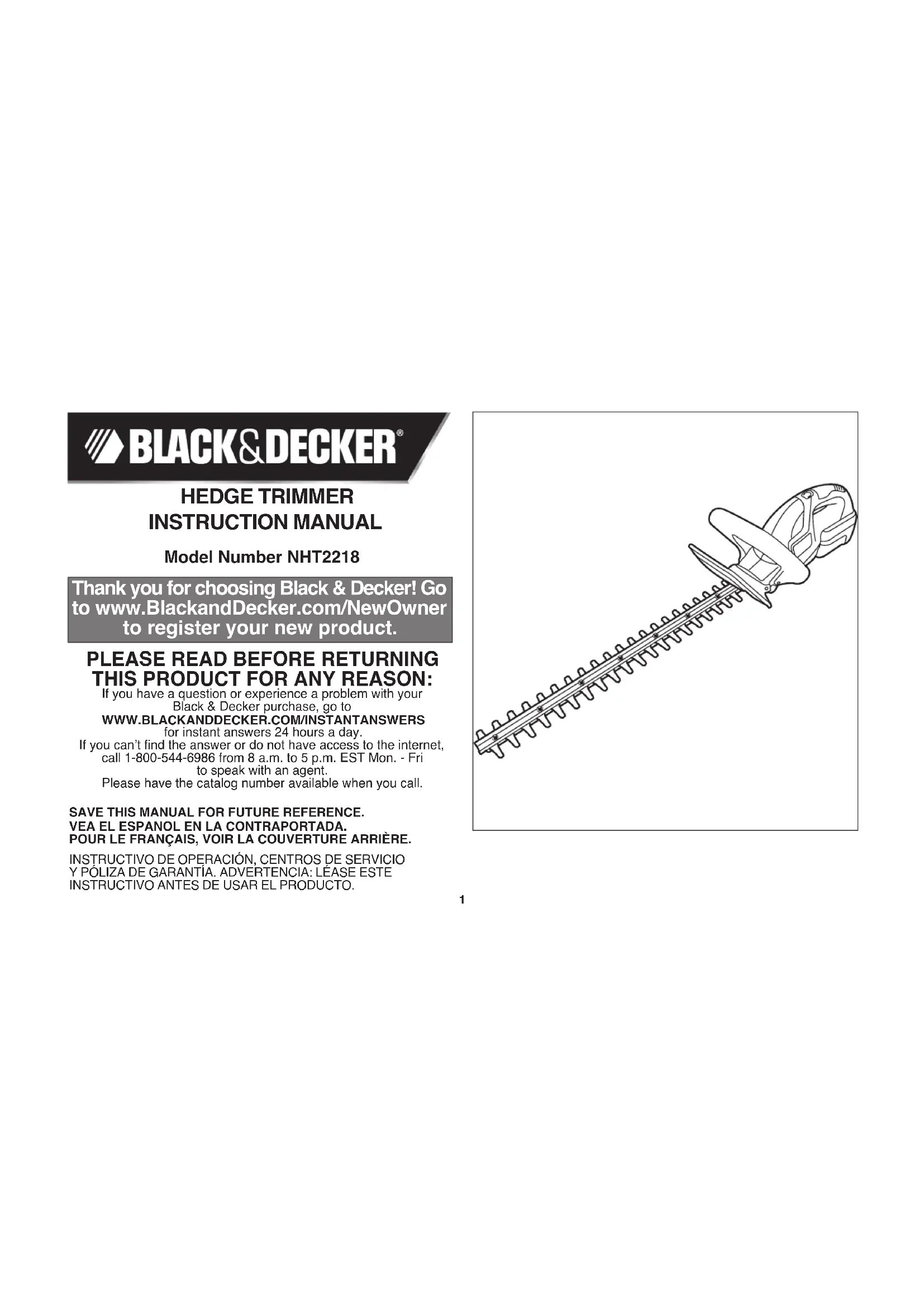Download the instructions for your Hedge trimmers in PDF format for free! Find your manual NHT2218 - BLACK & DECKER and take your electronic device back in hand. On this page are published all the documents necessary for the use of your device. NHT2218 by BLACK & DECKER.