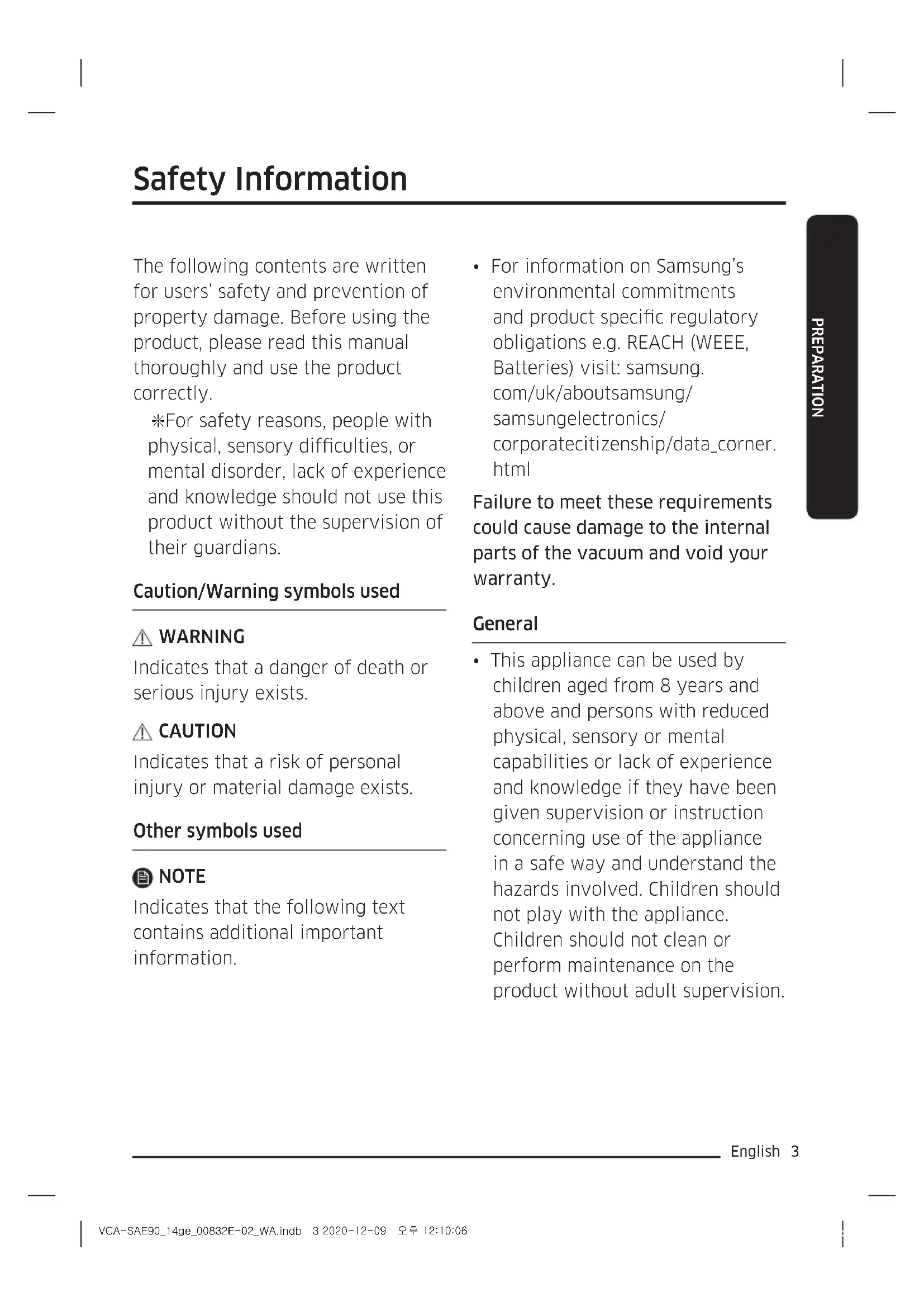 - This appliance can be used by children aged from 8 years and above and persons with reduced physical, sensory or mental capabilities or lack of experience and knowledge if they have been given supervision or instruction concerning use of the appliance in a safe way and understand the hazards involved. Children should not play with the appliance. Children should not clean or perform maintenance on the product without adult supervision. Safety Information PREPARATION VCA-SAE90_14ge_00832E-02_WA.indb 3 2020-12-09 오후 12:10:06English