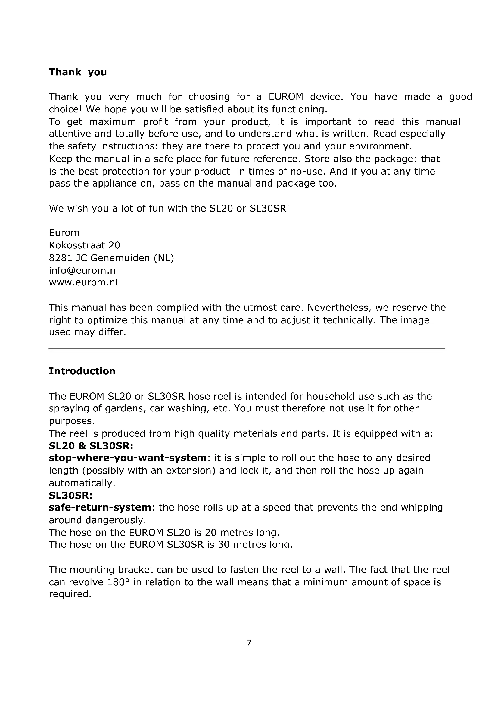 Introduction The EUROM SL20 or SL30SR hose reel is intended for household use such as the spraying of gardens, car washing, etc. You must therefore not use it for other purposes. The reel is produced from high quality materials and parts. It is equipped with a: SL20 & SL30SR: stop-where-you-want-system: it is simple to roll out the hose to any desired length (possibly with an extension) and lock it, and then roll the hose up again automatically. SL30SR: safe-return-system: the hose rolls up at a speed that prevents the end whipping around dangerously. The hose on the EUROM SL20 is 20 metres long. The hose on the EUROM SL30SR is 30 metres long. The mounting bracket can be used to fasten the reel to a wall. The fact that the reel can revolve 180° in relation to the wall means that a minimum amount of space is required.8 Technical date Model SL20 SL30SR Length of hose 20 m 30 m Hose material PVC PVC Housing material