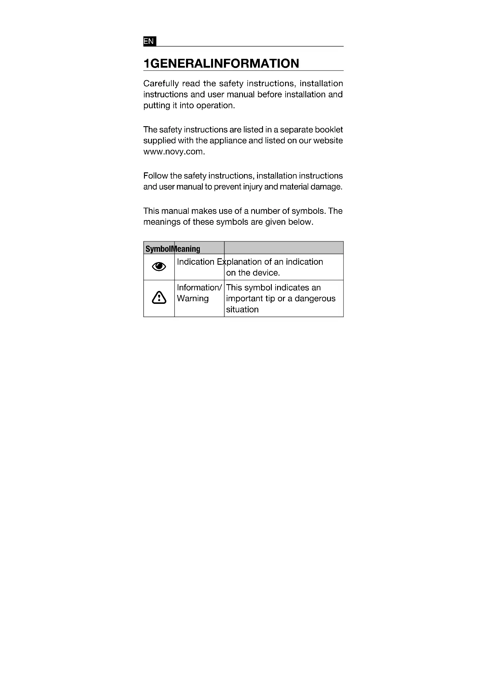 1 GENERAL INFORMATION Carefully read the safety instructions, installation instructions and user manual before installation and putting it into operation. The safety instructions are listed in a separate booklet supplied with the appliance and listed on our website www.novy.com. Follow the safety instructions, installation instructions and user manual to prevent injury and material damage. This manual makes use of a number of symbols. The meanings of these symbols are given below. Symbol Meaning