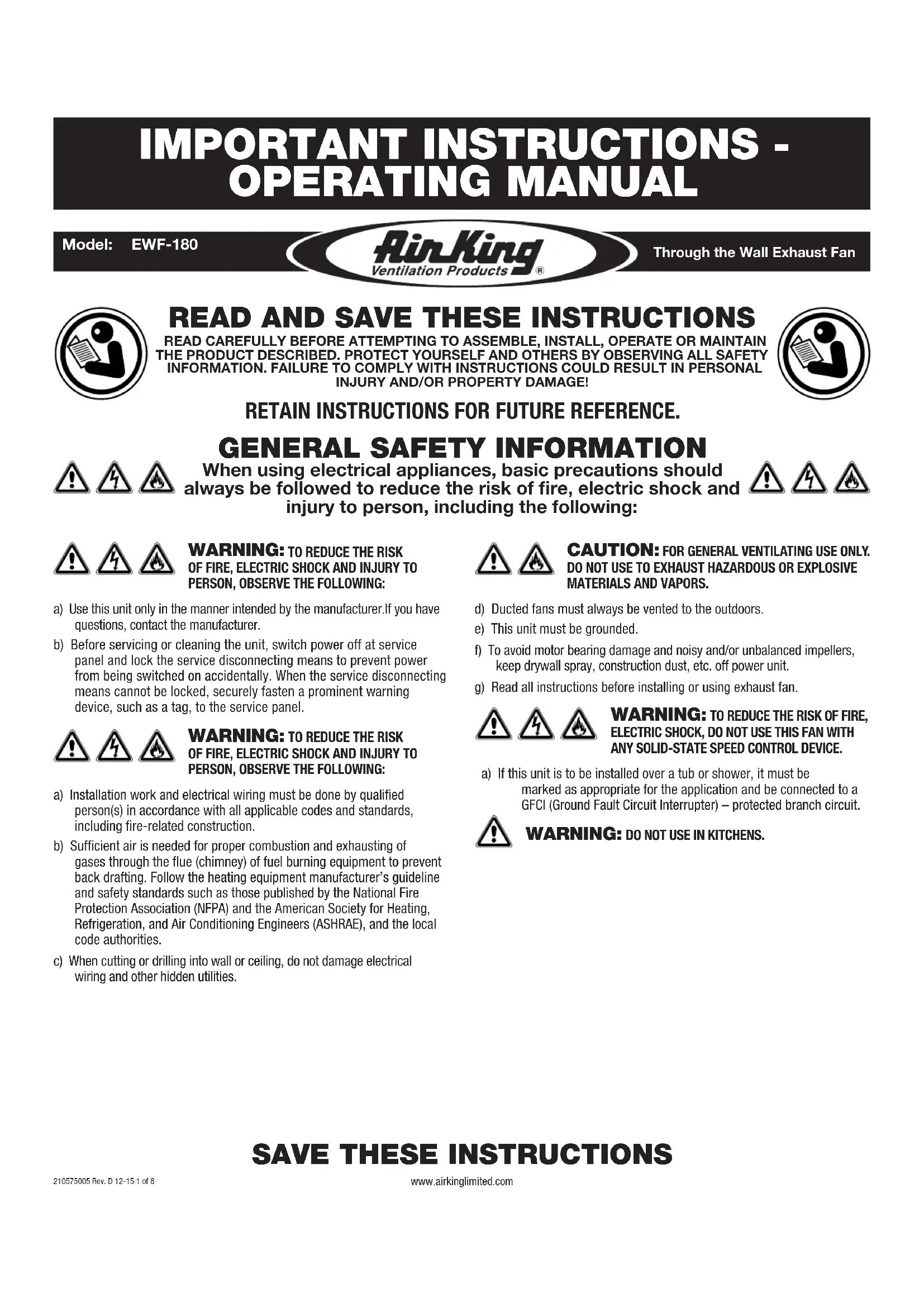 www.airkinglimited.com210575005 Rev. D 12-15 1 of 8Through the Wall Exhaust Fan Model: EWF-180