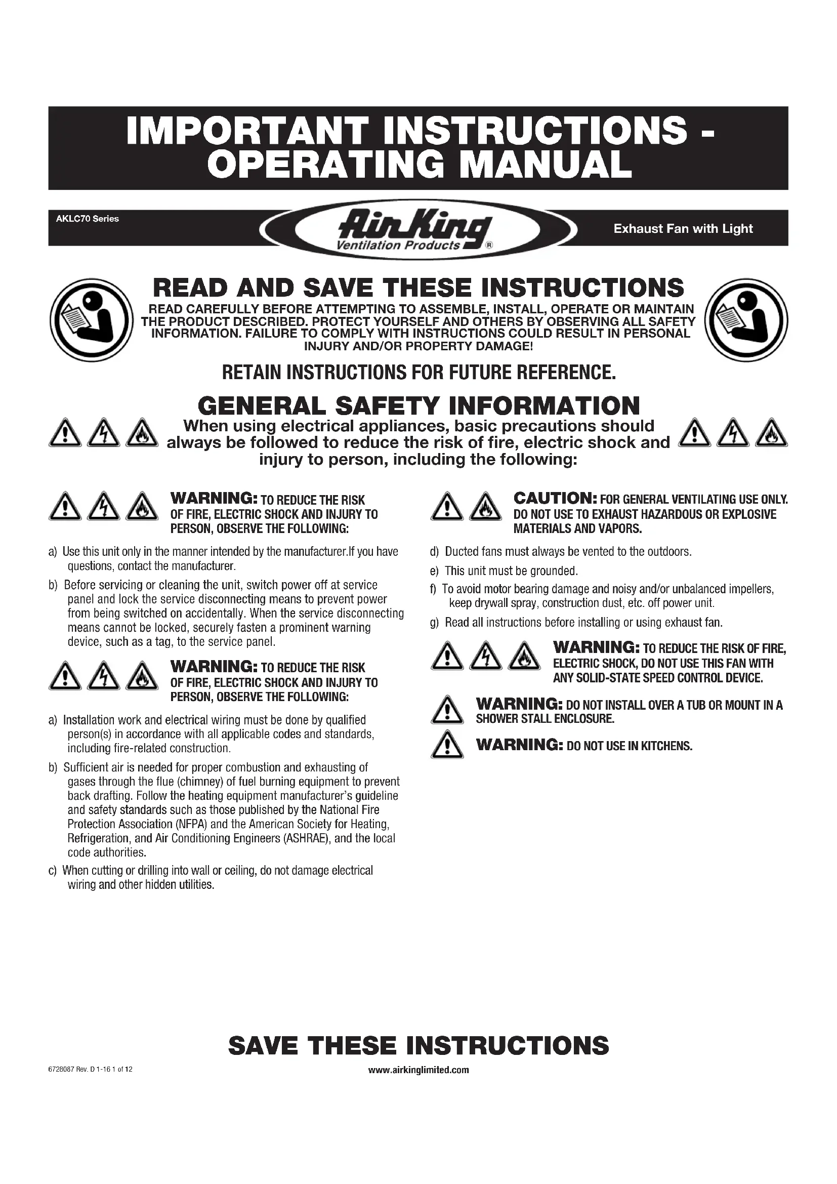www.airkinglimited.com6728087 Rev. D 1-16 1 of 12 Exhaust Fan with Light AKLC70 Series