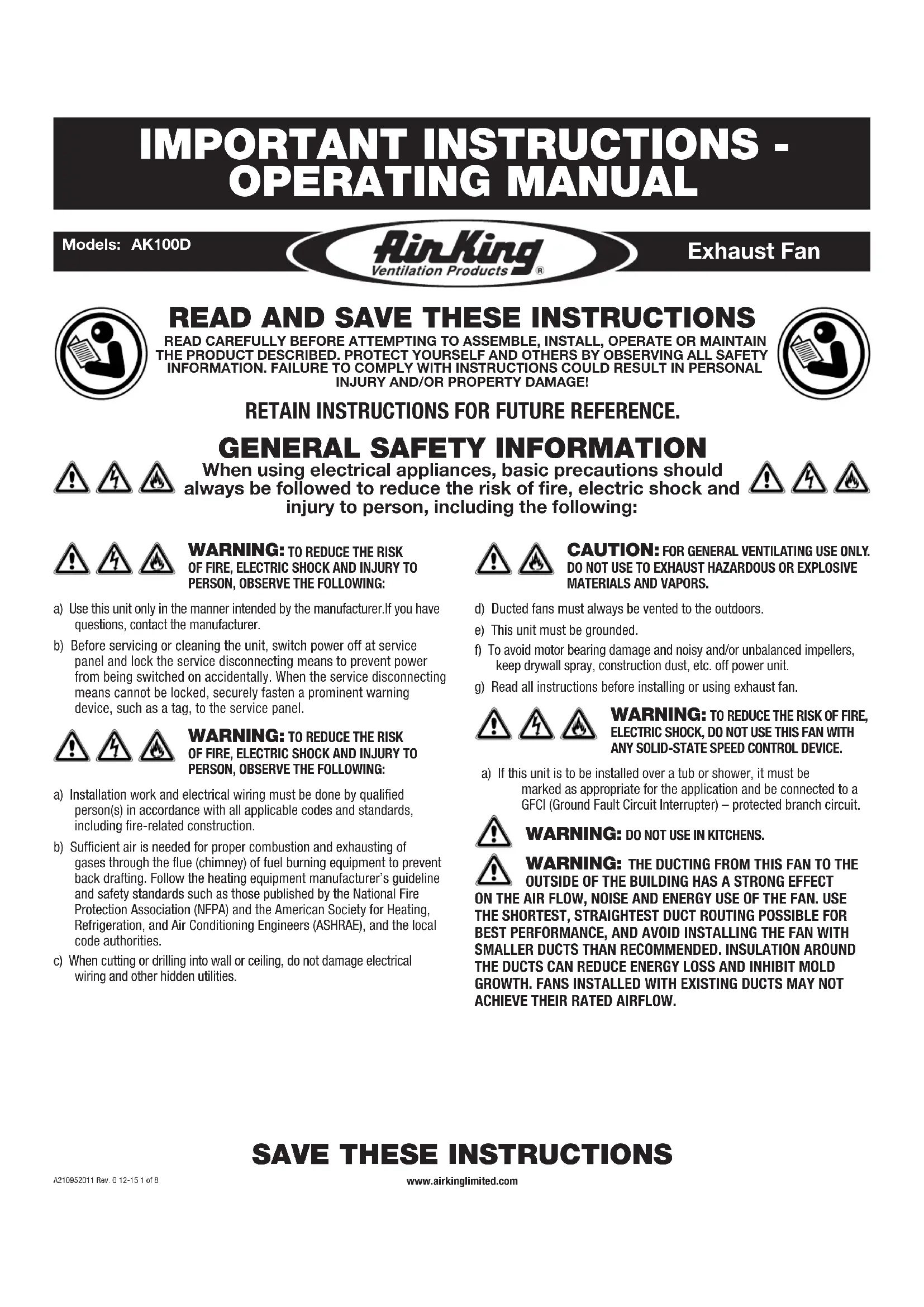 g) Read all instructions before installing or using exhaust fan.
