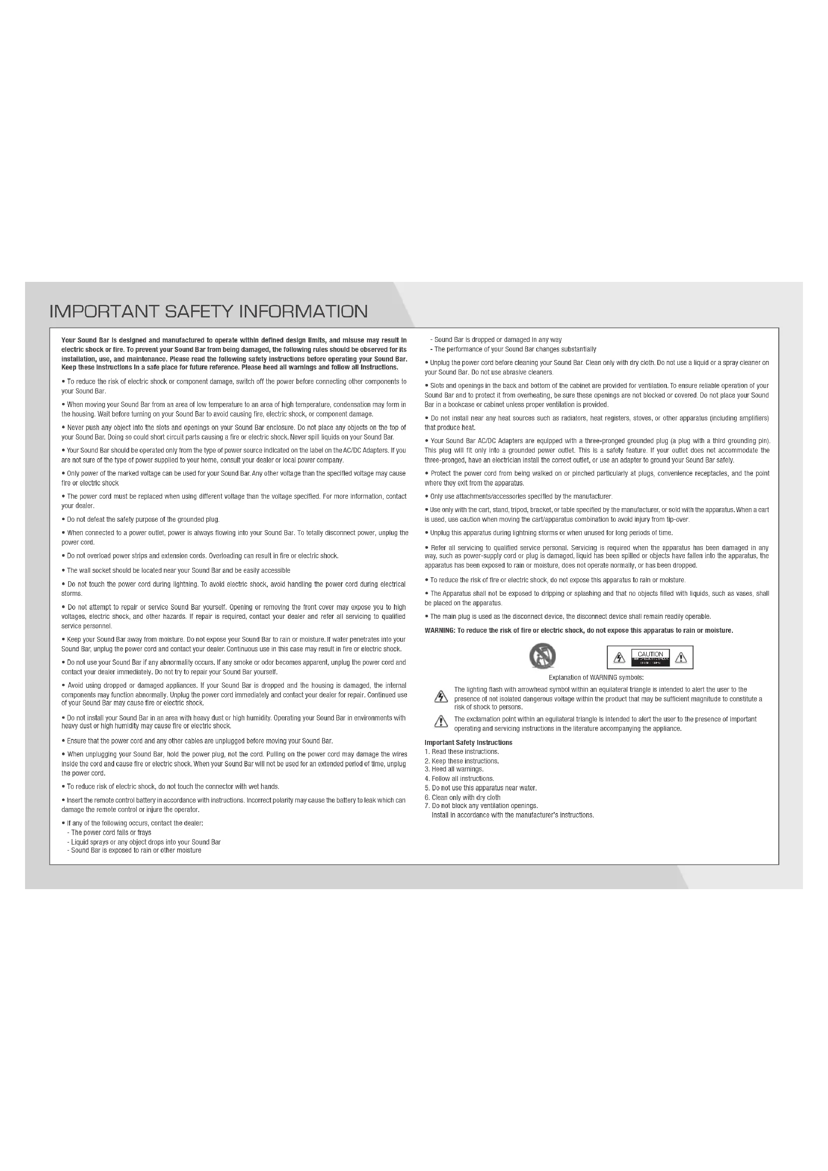Your Sound Bar is designed and manufactured to operate within defined design limits, and misuse may result in electric shock or fire. To prevent your Sound Bar from being damaged, the following rules should be observed for its installation, use, and maintenance. Please read the following safety instructions before operating your Sound Bar. Keep these instructions in a safe place for future reference. Please heed all warnings and follow all instructions.
