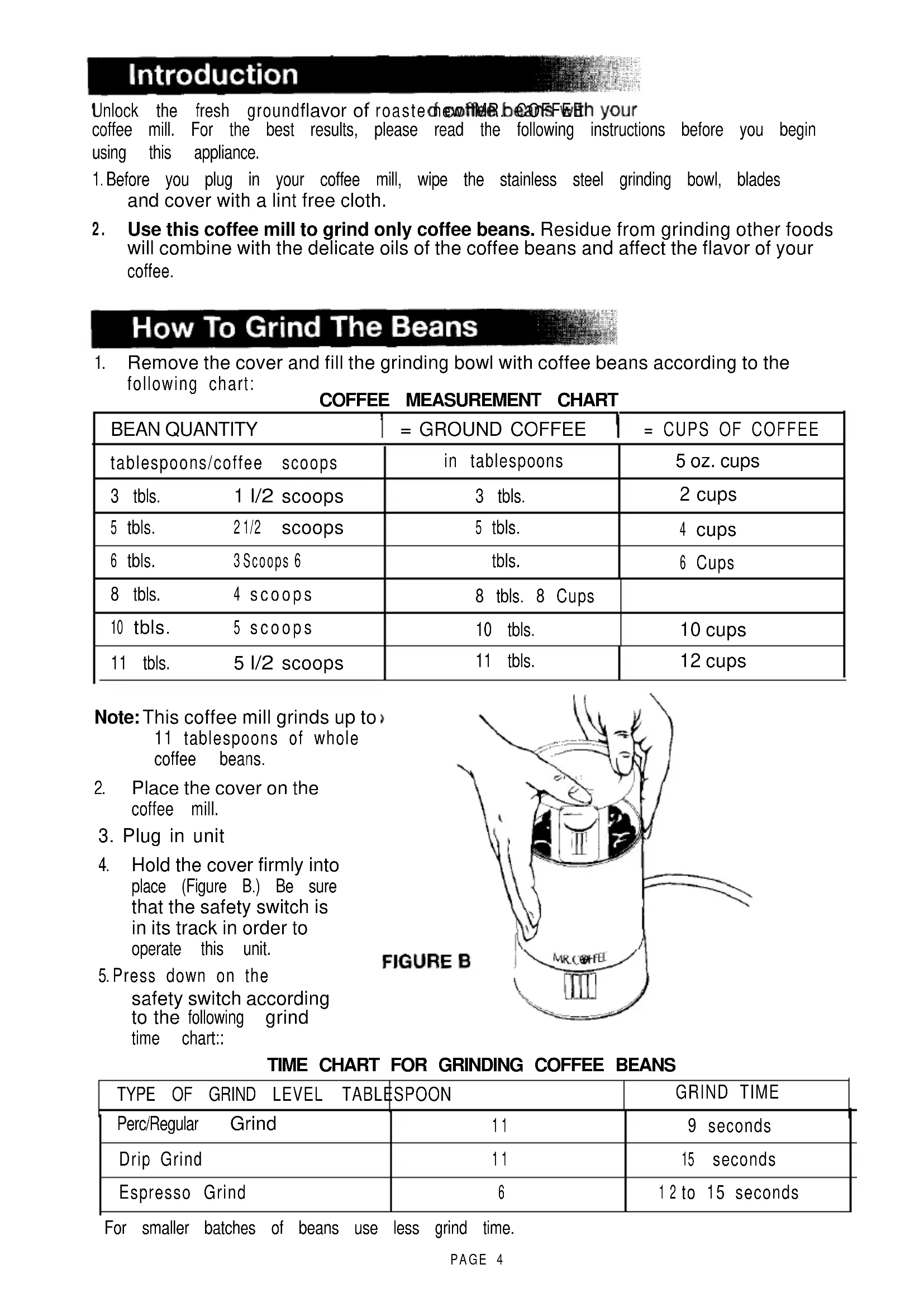 l/2 scoops 11 tbls. 12 cups Unlock the fresh ground flavor of roaste new MR. COFFEE coffee mill. For the best results, please read the following instructions before you begin using this appliance.