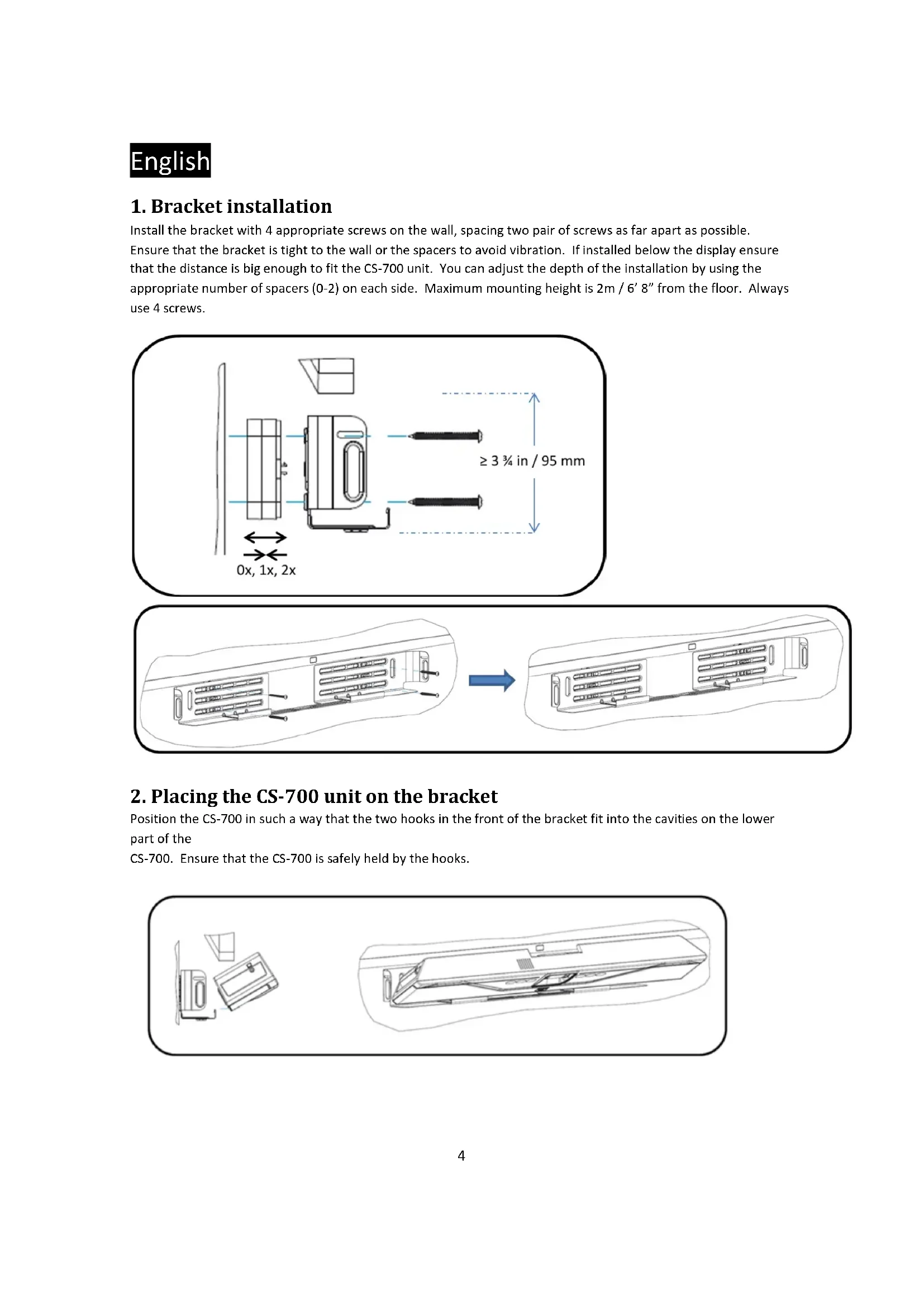 Position the CS-700 in such a way that the two hooks in the front of the bracket fit into the cavities on the lower part of the CS-700. Ensure that the CS-700 is safely held by the hooks. 0x, 1x, 2x ≥ 3 ¾ in / 95 mmEnglish