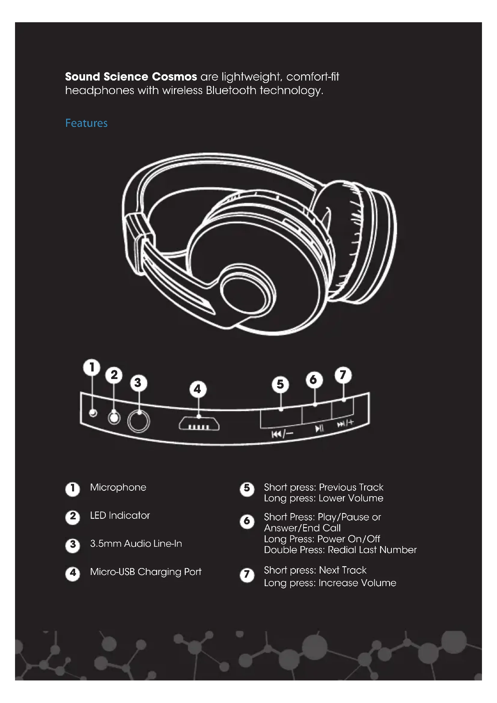 Comfort-Fit Wireless HeadphonesSound Science Cosmos are lightweight, comfort-fit headphones with wireless Bluetooth technology. Microphone LED Indicator Short press: Previous Track Long press: Lower Volume Micro-USB Charging Port Short press: Next Track Long press: Increase Volume Short Press: Play/Pause or Answer/End Call Long Press: Power On/Off Double Press: Redial Last Number 3.5mm Audio Line-In