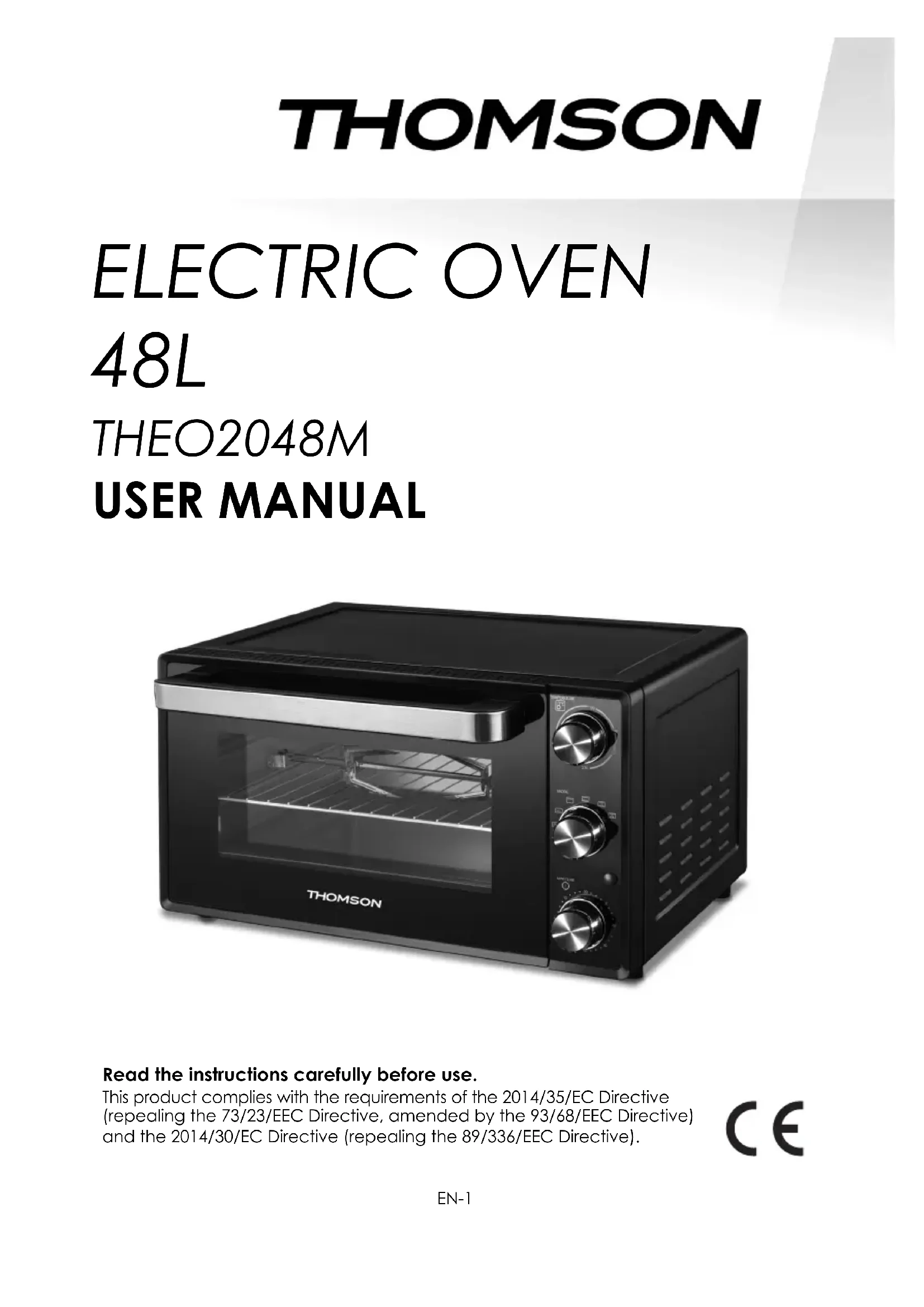 12, rue Jules Ferry, 93110 Rosny-sous-Bois, FRANCEEN-1 ELECTRIC OVEN 48L THEO2048M USER MANUAL Read the instructions carefully before use. This product complies with the requirements of the 2014/35/EC Directive (repealing the 73/23/EEC Directive, amended by the 93/68/EEC Directive) and the 2014/30/EC Directive (repealing the 89/336/EEC Directive).EN-2