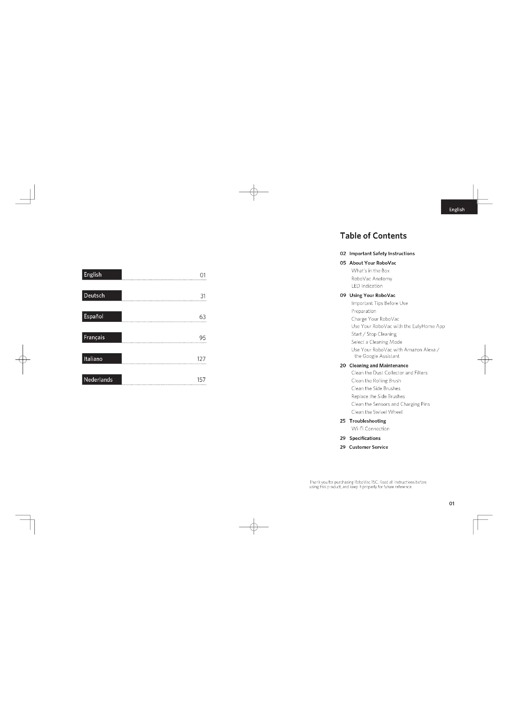 - Google Home is a trademark of Google Inc. About Your RoboVac What's in the Box RoboVac 15C Power Adapter Cleaning Tool Side Brushes (x4) Charging Base Remote Control (AAA Battery x2) Additional High-Performance Filter Owner’s Manual & Other Documents Additional Foam Filter Cable Ties (x5)06 07 English English RoboVac Anatomy Top & Side Auto cleaning Start/Stop button Wi-Fi status light Bumper Dust collector Dust collector release button Infrared sensor Bottom Drop sensors Charging contact pins Battery compartment Brush guard Rolling brush Main power switch (On/O) Swivel wheel Side brushes Wheels Dust collector Dust Collector Pre-filter Foam filter High-performance filter Suction Inlet Dust collector Suction inlet Charging Base Charging contact pinsStatus lightPower cord storage compartmentPower socket08 09 English English Remote Control