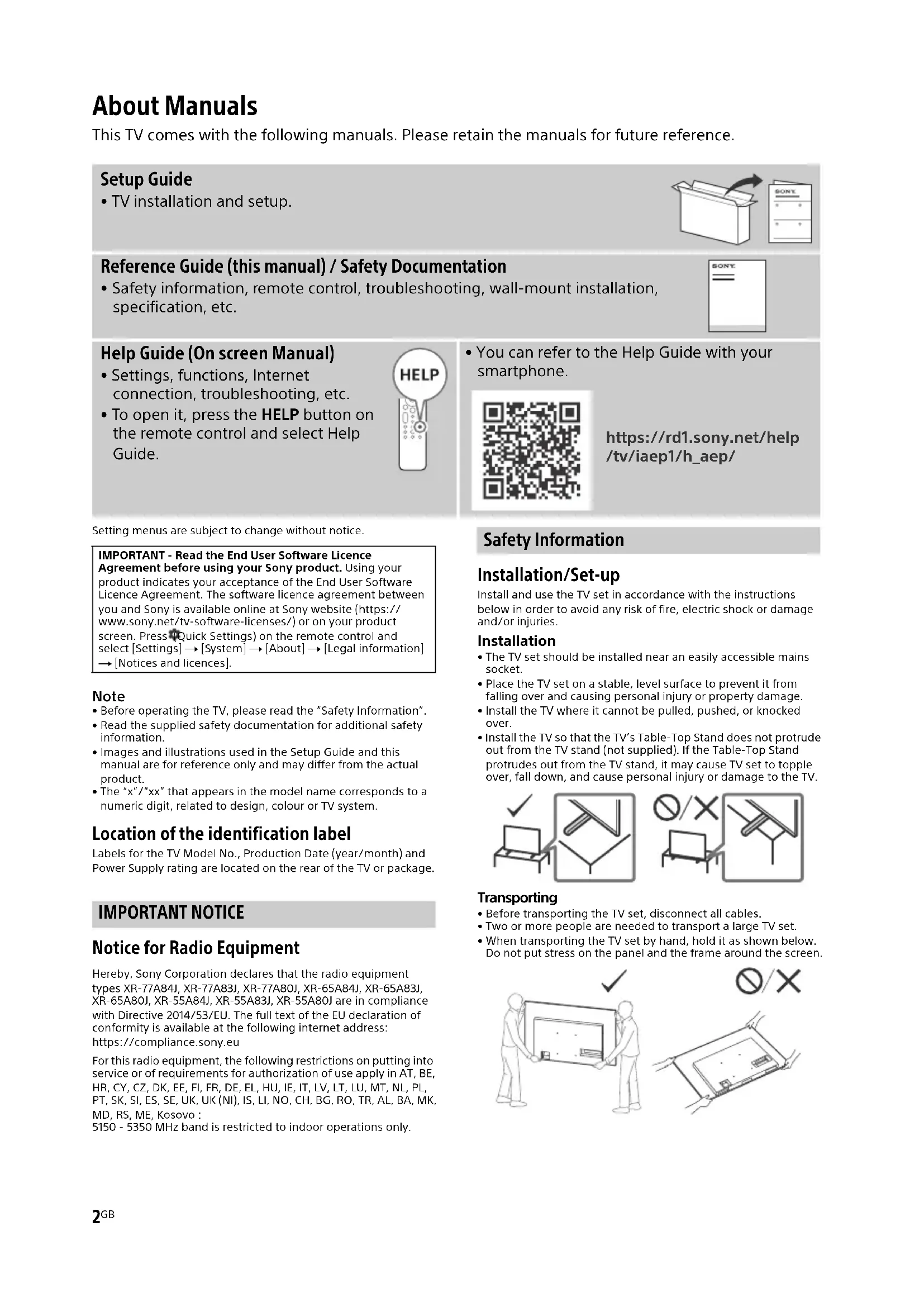 - Before operating the TV, please read the “Safety Information”.• Read the supplied safety documentation for additional safety information.• Images and illustrations used in the Setup Guide and this manual are for reference only and may differ from the actual product.• The “x”/“xx” that appears in the model name corresponds to a numeric digit, related to design, colour or TV system. Location of the identification label Labels for the TV Model No., Production Date (year/month) and Power Supply rating are located on the rear of the TV or package. IMPORTANT NOTICE Notice for Radio Equipment Hereby, Sony Corporation declares that the radio equipment types XR-77A84J, XR-77A83J, XR-77A80J, XR-65A84J, XR-65A83J, XR-65A80J, XR-55A84J, XR-55A83J, XR-55A80J are in compliance with Directive 2014/53/EU. The full text of the EU declaration of conformity is available at the following internet address: https://compliance.sony.euFor this radio equipment, the following restrictions on putting into service or of requirements for authorization of use apply in AT, BE, HR, CY, CZ, DK, EE, FI, FR, DE, EL, HU, IE, IT, LV, LT, LU, MT, NL, PL, PT, SK, SI, ES, SE, UK, UK (NI), IS, LI, NO, CH, BG, RO, TR, AL, BA, MK, MD, RS, ME, Kosovo :5150 - 5350 MHz band is restricted to indoor operations only. Safety Information Installation/Set-up Install and use the TV set in accordance with the instructions below in order to avoid any risk of fire, electric shock or damage and/or injuries. Installation