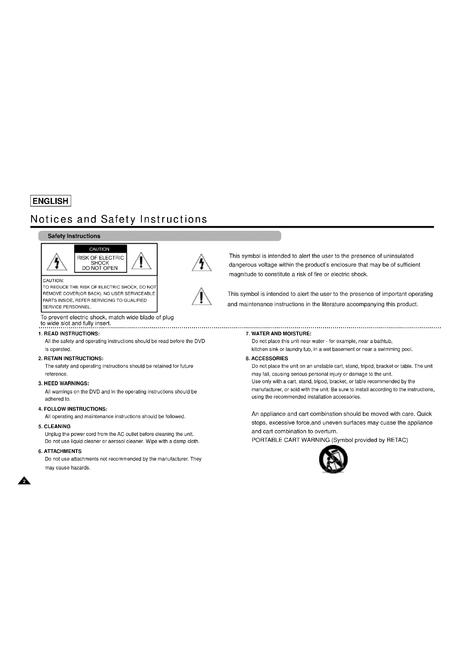 Do not place the unit on an unstable cart, stand, tripod, bracket or table. The unit may fall, causing serious personal injury or damage to the unit.Use only with a cart, stand, tripod, bracket, or table recommended by themanufacturer, or sold with the unit. Be sure to install according to the instructions,using the recommended installation accessories. An appliance and cart combination should be moved with care. Quick stops, excessive force,and uneven surfaces may cuase the appliance and cart combination to overturn. PORTABLE CART WARNING (Symbol provided by RETAC) Notices and Safety Instructions