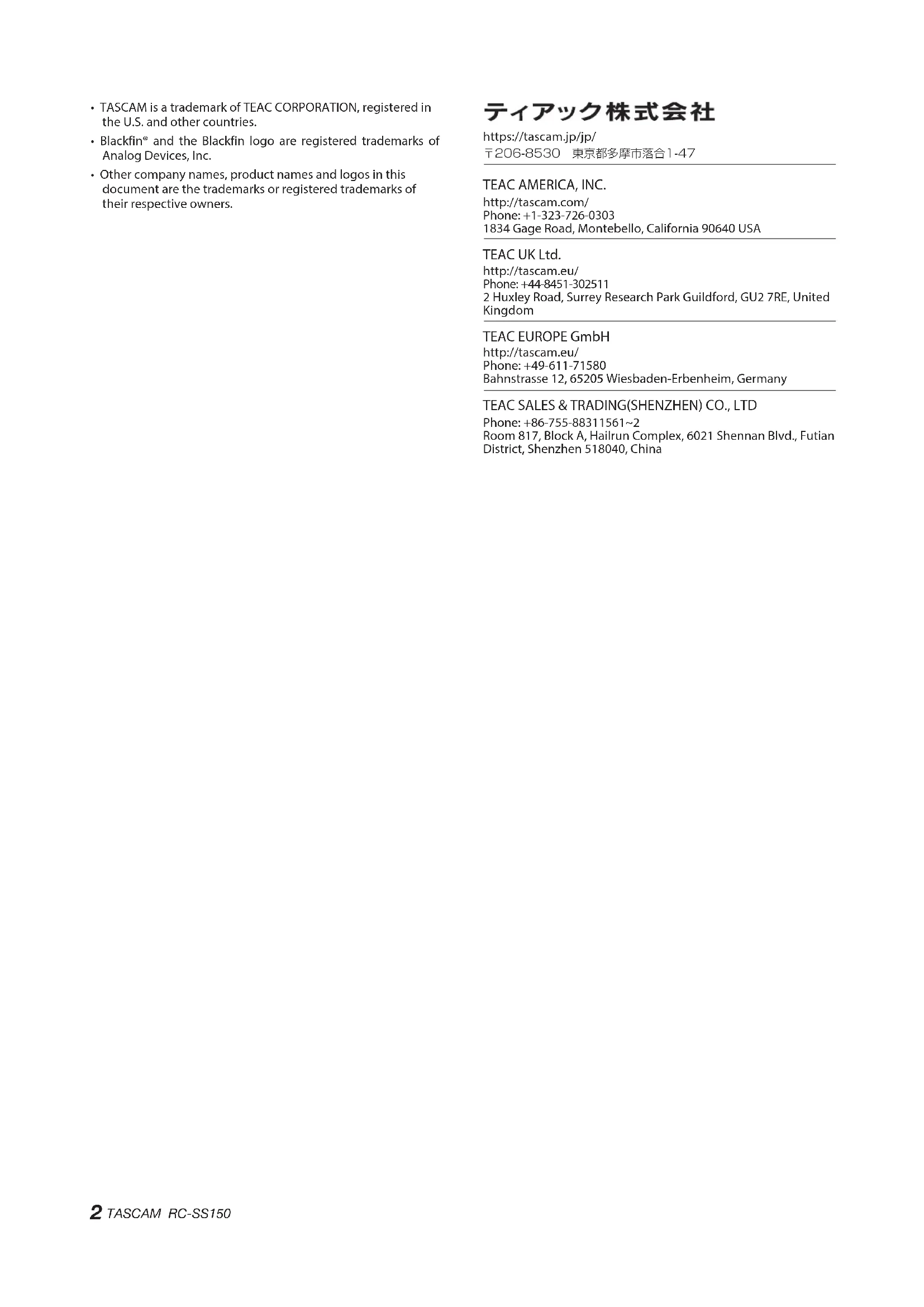 - TASCAM is a trademark of TEAC CORPORATION, registered in the U.S. and other countries.