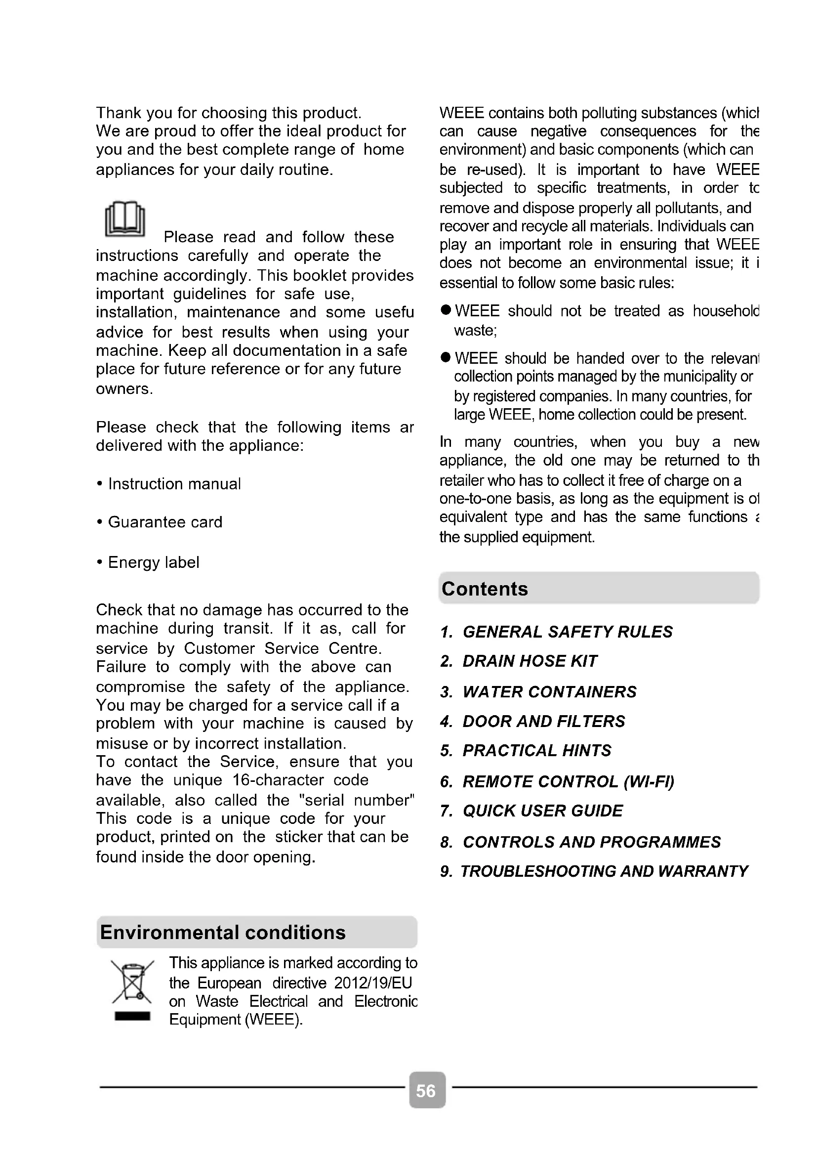 Thank you for choosing this product. We are proud to offer the ideal product for you and the best complete range of home appliances for your daily routine. Please read and follow these instructions carefully and operate the machine accordingly. This booklet provides important guidelines for safe use, installation, maintenance and some useful advice for best results when using your machine. Keep all documentation in a safe place for future reference or for any future owners. Please check that the following items are delivered with the appliance: