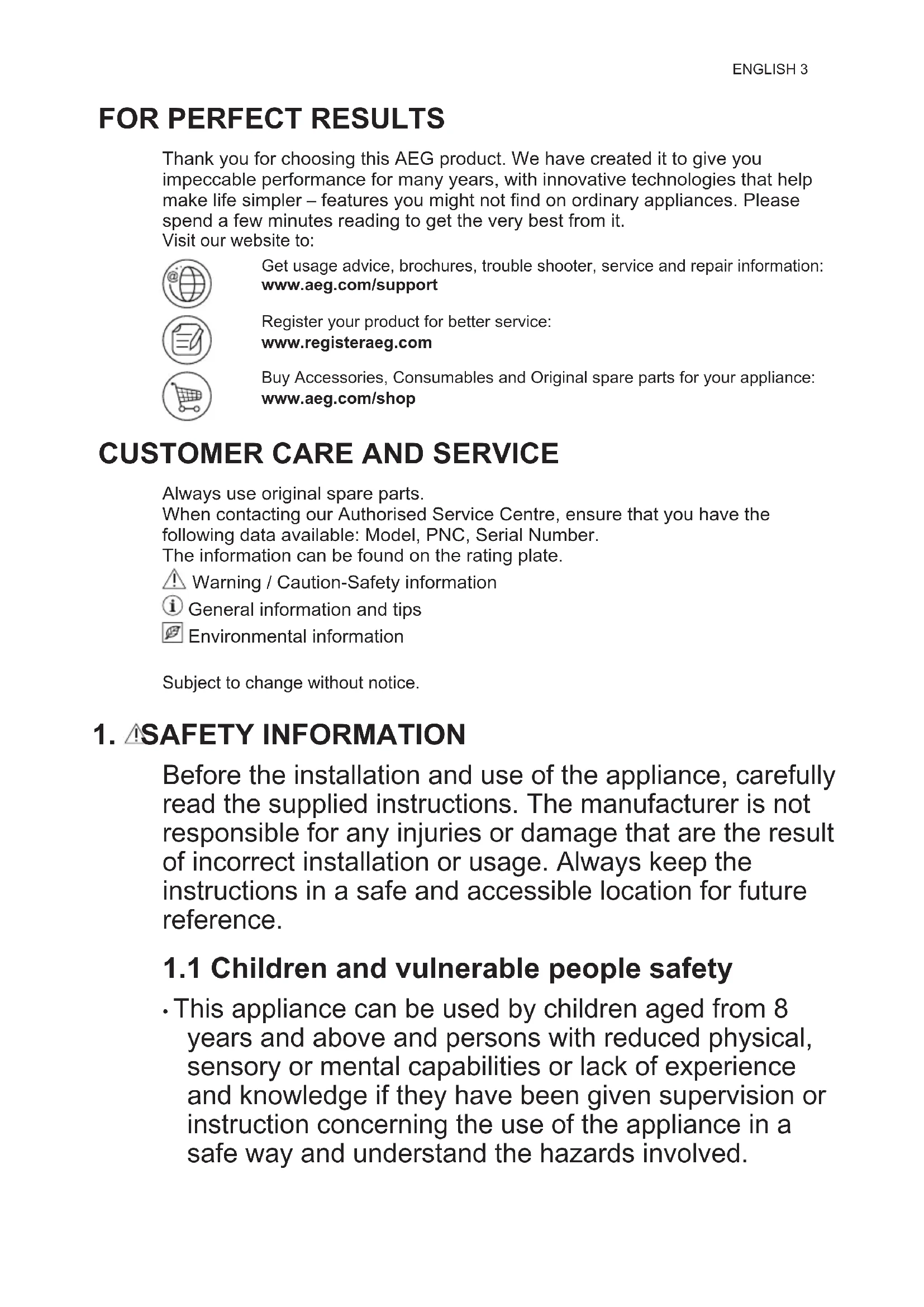 Always use original spare parts. When contacting our Authorised Service Centre, ensure that you have the following data available: Model, PNC, Serial Number. The information can be found on the rating plate. Warning / Caution-Safety information General information and tips Environmental information Subject to change without notice.