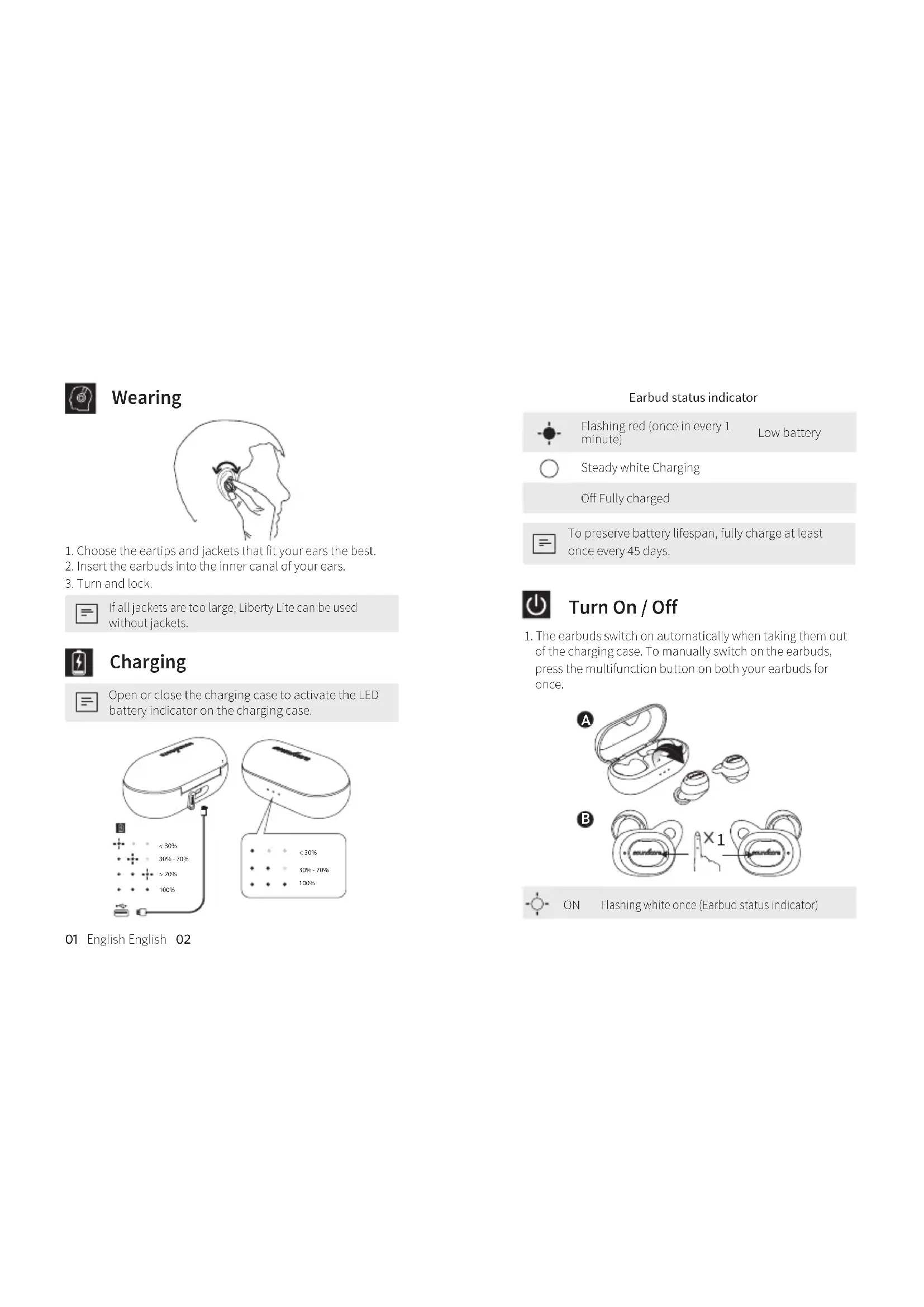 If all jackets are too large, Liberty Lite can be used without jackets. Charging Open or close the charging case to activate the LED battery indicator on the charging case. < 30% 30% - 70% > 70% 100% < 30%30% - 70% 100%03 English English 04 Rapidly flashing white Pairing mode Slow flashing white Connected to a device