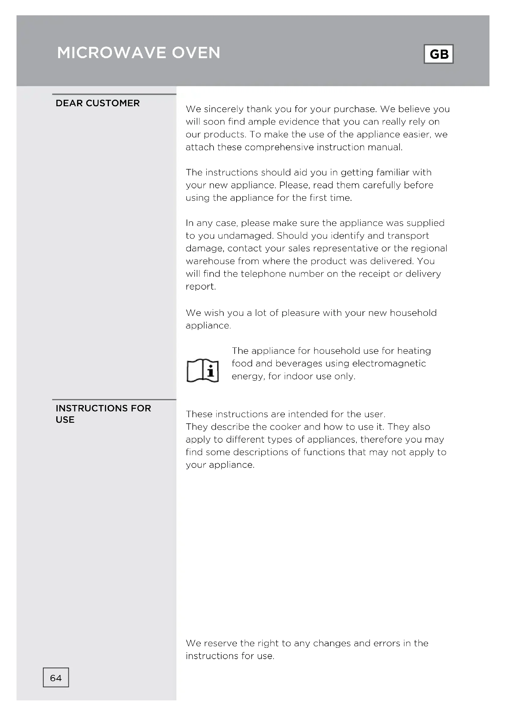 a) Check to see whether the timer is set. b) Check to make sure that the door is securely closed to engage the safety interlocks. Otherwise, the microwave energy will not flow into the oven. If none of the above rectify the situation, then contact the nearest authorized service agent. The appliance for household use for heating food and beverages using electromagnetic energy, for indoor use only. If you need information or if you have a problem, please contact the Gorenje Customer Care Centre in your country (you find its phone number in the worldwide guarantee leaflet). If there is no Customer Care Centre in your country, go to your local Gorenje dealer or contact the Service department of Gorenje domestic appliances. Eventual mismatches in colour shades between dierent appliances or components within a single design line may occur due to various factors, such as dierent angles under which the appliances are observed, dierent coloured backgrounds, materials, and room illumination. For personal use only! Additional recommendations for cooking with microwave and useful advices can be found on web side: http://www.gorenje.com WISHES YOU A LOT OF PLEASURE WHILE USING YOUR APPLIANCE