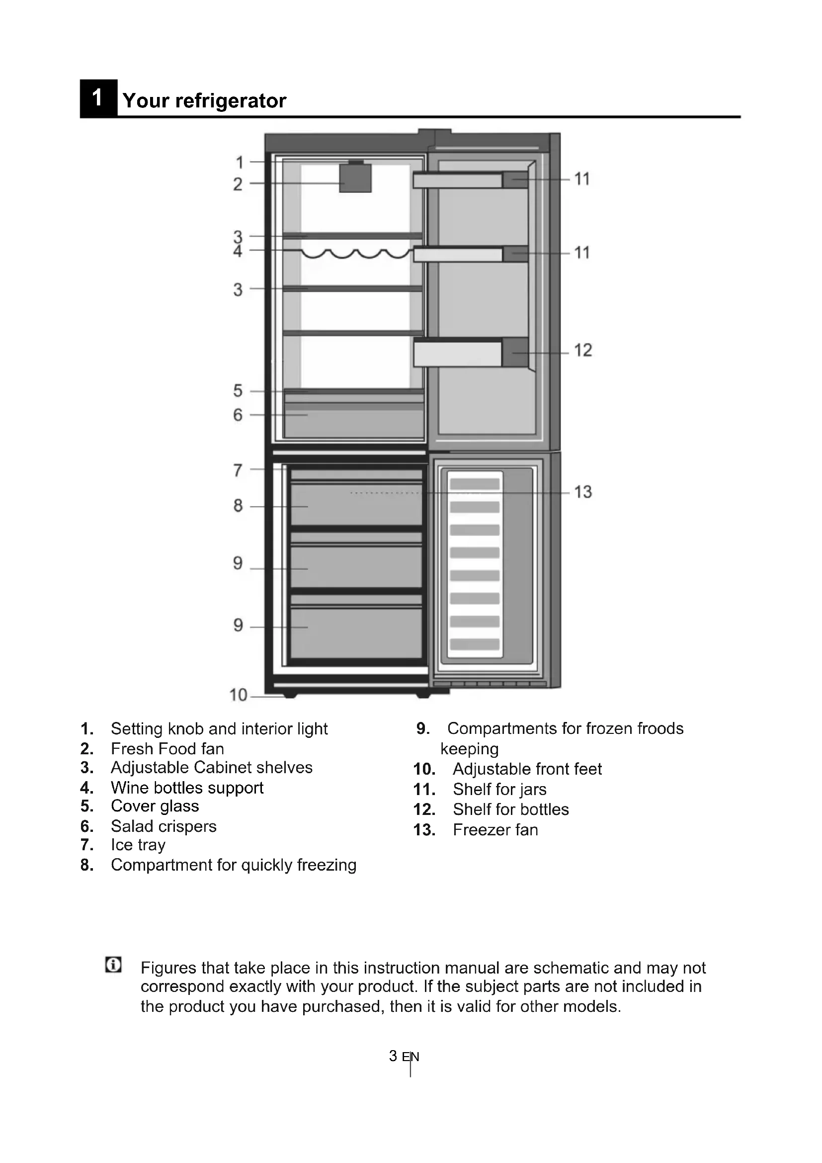 damage the refrigerator. z If there is a blue light on the refrigerator, do not look at the blue light with optical tools. z For manually controlled refrigerators, wait for at least 5 minutes to start the refrigerator after power failure. z This operation manual should be handed in to the new owner of the product when it is given to others. z Avoid causing damage on power cable when transporting the refrigerator. Bending cable may cause fire. Never place heavy objects on power cable. z Do not touch the plug with wet hands when plugging the product. z Do not plug the refrigerator if the wall outlet is loose. z Water should not be sprayed on inner or outer parts of the product for safety purposes. 5 EN6 EN z Do not spray substances containing inflammable gases such as propane gas near the refrigerator to avoid fire and explosion risk. z Never place containers filled with water on top of the refrigerator; in the event of spillages, this may cause electric shock or fire. z Do not overload the refrigerator with food. If overloaded, the food items may fall down and hurt you and damage refrigerator when you open the door. z Never place objects on top of the refrigerator; otherwise, these objects may fall down when you open or close the refrigerator's door. z As they require a precise temperature, vaccines, heat- sensitive medicine and scientific materials and etc. should not be kept in the refrigerator. z If not to be used for a long time, refrigerator should be unplugged. A possible problem in power cable may cause fire. z The plug's tip should be cleaned regularly with a dry cloth; otherwise, it may cause fire. z Refrigerator may move if adjustable legs are not properly secured on the floor. Properly securing adjustable legs on the floor can prevent the refrigerator to move. z When carrying the refrigerator, do not hold it from door handle. Otherwise, it may be snapped. z When you have to place your product next to another refrigerator or freezer, the distance between devices should be at least 8cm. Otherwise, adjacent side walls may be humidified. For products with a water dispenser; Pressure of water mains should be minimum 1 bar. Pressure of water mains should be maximum 8 bars.