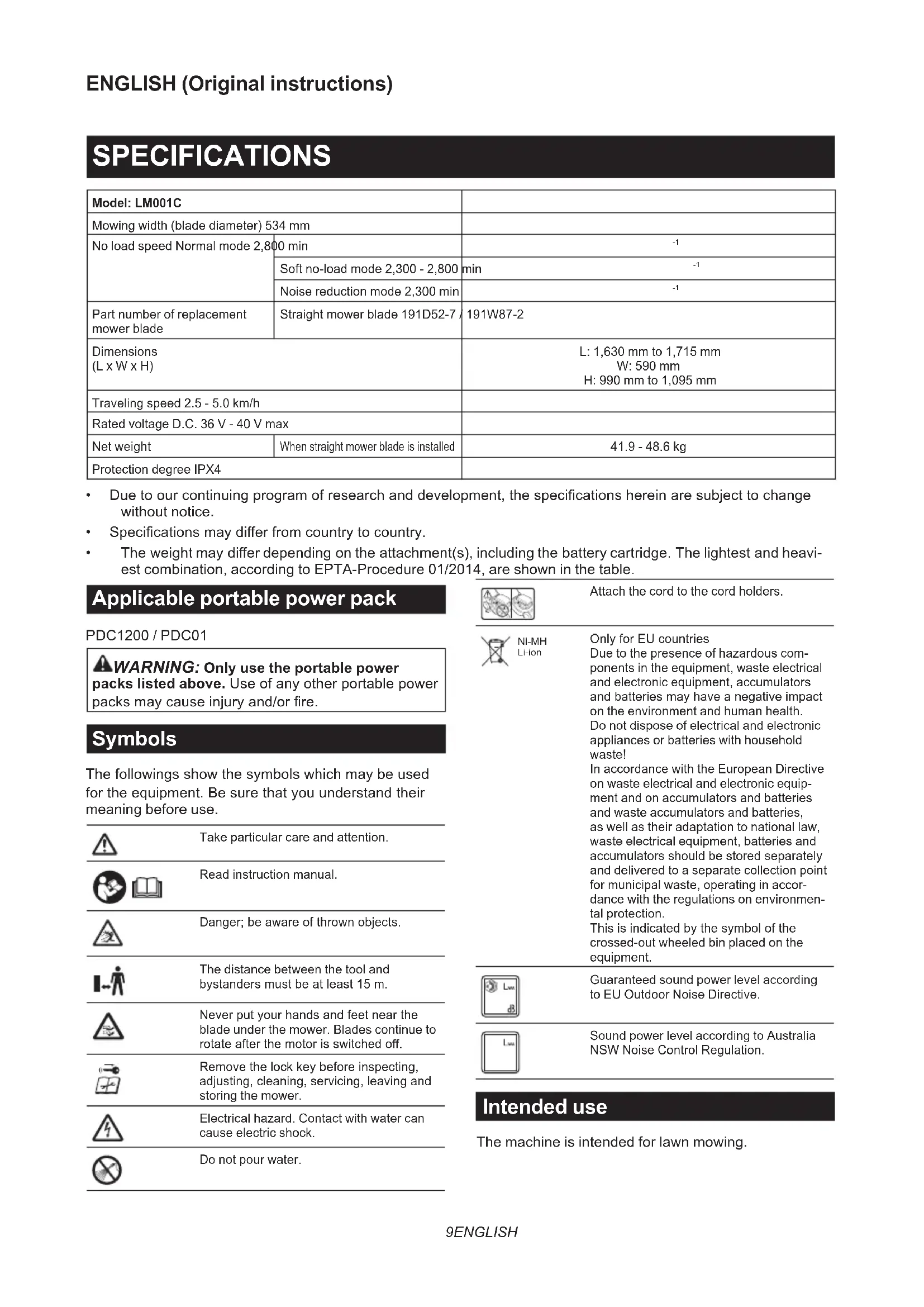 packs listed above.Useofanyotherportablepower packsmaycauseinjuryand/orre. Symbols Thefollowingsshowthesymbolswhichmaybeused fortheequipment.Besurethatyouunderstandtheir meaning before use. Take particular care and attention. Read instruction manual. Danger;beawareofthrownobjects. The distance between the tool and bystandersmustbeatleast15m. Neverputyourhandsandfeetnearthe blade under the mower. Blades continue to rotateafterthemotorisswitchedo. Removethelockkeybeforeinspecting, adjusting,cleaning,servicing,leavingand storing the mower. Electrical hazard. Contact with water can cause electric shock. Do not pour water. Attach the cord to the cord holders. Ni-MH Li-ion OnlyforEUcountries Due to the presence of hazardous com- ponents in the equipment, waste electrical and electronic equipment, accumulators andbatteriesmayhaveanegativeimpact on the environment and human health. Do not dispose of electrical and electronic appliances or batteries with household waste! In accordance with the European Directive on waste electrical and electronic equip- ment and on accumulators and batteries and waste accumulators and batteries, as well as their adaptation to national law, waste electrical equipment, batteries and accumulatorsshouldbestoredseparately and delivered to a separate collection point for municipal waste, operating in accor- dance with the regulations on environmen- tal protection. Thisisindicatedbythesymbolofthe crossed-out wheeled bin placed on the equipment. Guaranteed sound power level according to EU Outdoor Noise Directive. Sound power level according to Australia NSW Noise Control Regulation. Intended use The machine is intended for lawn mowing.10 ENGLISH About this instruction manual Theterm"battery"or"batterycartridge"inthisinstruc- tion manual refers to the followings: